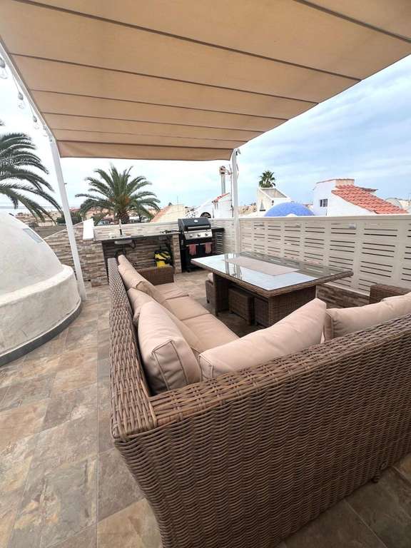 Casa pareada recién reformada de 3 dormitorios con solarium en Playa Flamenca Esta acogedora casa pareada combina confort moderno, privacidad y un entorno natural privilegiado. Ubicada en una zona muy verde, rodeada de agradables áreas arboladas y espacios tranquilos, esta vivienda ofrece un estilo de vida relajado y cómodo, ideal tanto para vivir todo el año como para disfrutar de estancias vacacionales. En la planta baja se encuentra la zona principal de la vivienda, distribuida en tres dormitorios amplios y luminosos, además de dos cuartos de baño elegantemente reformados. La cocina, totalmente equipada, se integra a la perfección con el salón, creando un espacio amplio y funcional donde disfrutar de momentos en familia. La reforma es de altísima calidad, con detalles como suelo radiante, paneles solares y mobiliario de buen nivel que aportan confort, eficiencia y un estilo contemporáneo. La joya de la casa es su solárium privado, un espacio único con preciosas vistas a las zonas verdes del entorno. Aquí encontrarás una fantástica zona de barbacoa, pérgola para disfrutar a la sombra y una cómoda área de lavandería, convirtiéndolo en el rincón perfecto para relajarte, recibir invitados o disfrutar del clima mediterráneo durante todo el año. Una vivienda completa, moderna y rodeada de naturaleza, lista para entrar a vivir y disfrutar. UBICACIÓN: Playa Flamenca es una zona exclusiva y principalmente residencial con todas las comodidades necesarias y rodeada por zonas verdes. Rodeada de buenos restaurantes a orillas del mar, es el sitio perfecto para descansar. Tiene buenas conexiones tanto por Carretera Nacional como por Autovía. También con buenas conexiones de autobuses y taxis. Cuenta tanto con playas de arena como calas de roca. El hospital más cercano es el Hospital Universitario de Torrevieja (a 4 km), y a pocos minutos podemos encontrar el Hospital Quirónsalud Torrevieja. También cuenta con aeropuertos como el Aeropuerto internacional de la Región de Murcia (a 35 km) y el de Alicante (a 47 km). DISTANCIA AL MAR: 2000m COMUNIDAD: 58 € al mes IBI: 101 € Si tiene alguna pregunta, no dude en ponerse en contacto con nosotros!