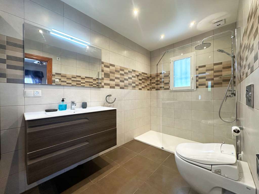 Nada más entrar, le recibirá un ambiente luminoso y acogedor gracias a su orientación sur, que permite que la luz natural inunde cada rincón. La villa está convenientemente situada en una sola planta y cuenta con tres amplios dormitorios dobles, perfectos para descansar y relajarse, así como dos baños con ducha a ras de suelo. La suite principal, con un armario empotrado de pared a pared y baño en suite, ofrece un toque de sofisticación, incluyendo calefacción por suelo radiante para mayor comodidad.