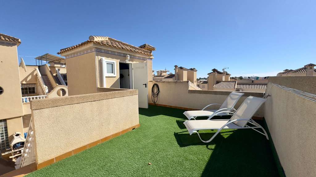 Una escalera conduce a la terraza de la azotea , cubierta de césped artificial , un lugar ideal para relajarse o recibir invitados. Debajo de la escalera hay un práctico trastero . En esta planta también hay una habitación adicional que podría utilizarse como tercer dormitorio, despacho o taller.