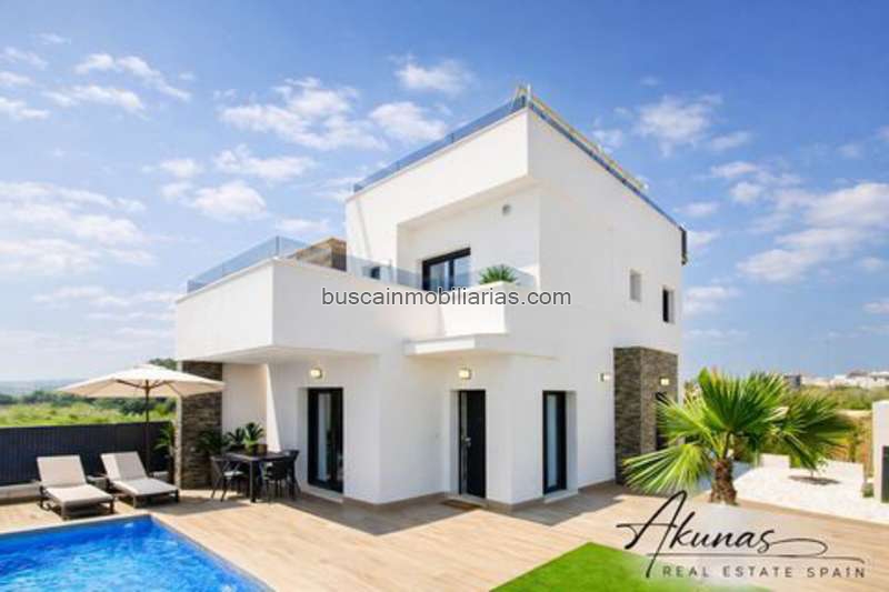 Detached modern villa for sale in Vistabella Golf, one of the most sought-after residential locations on the Costa Blanca South. This property combines sleek design, privacy, and an excellent location near golf, beaches, and all daily amenities, ideal for personal use and as an investment. The villa has been thoughtfully designed and features 3 bedrooms and 3 bathrooms, with a clear focus on space and light. The ground floor features an open-plan living concept with living room, dining area, and modern kitchen, directly connected to the terrace and garden. Large sliding windows provide a pleasant indoor-outdoor experience. In addition, there is a full bedroom and bathroom on this floor, offering extra flexibility. On the first floor are 2 en-suite bedrooms, one of which has a private terrace overlooking the garden and pool. The outdoor space is perfectly suited to Mediterranean living. Each villa has a private garden with a swimming pool and several terraces where privacy and relaxation are key. Whether it's sunbathing, dining outdoors, or relaxing with family and friends, this property offers the perfect setting. Optionally, a private solarium can be added for extra outdoor space and views. The location within Vistabella Golf is a clear added value. Within walking and short driving distance, you will find an 18-hole golf course, restaurants, sports facilities, supermarket, and pharmacy. The beaches of Orihuela Costa and Torrevieja are about a 15-minute drive away. Places such as Los Montesinos and San Miguel de Salinas offer additional amenities, while shopping centers and highways are easily accessible. The villas are built with high-quality materials and modern finishes. Standard features include pre-installation for air conditioning, underfloor heating in the bathrooms, a Mediterranean garden, private pool, and parking space on your own plot. This ensures comfortable living with strong long-term value. Are you looking for a modern villa for sale in an established area with high demand and excellent rental and value potential? This property in Vistabella Golf is perfect for those who value security, location, and quality of life. Contact us for availability and to schedule a viewing. Akunas Real Estate provides independent and professional guidance on purchasing property in Spain, with personal attention and expert advice throughout the entire purchase process.