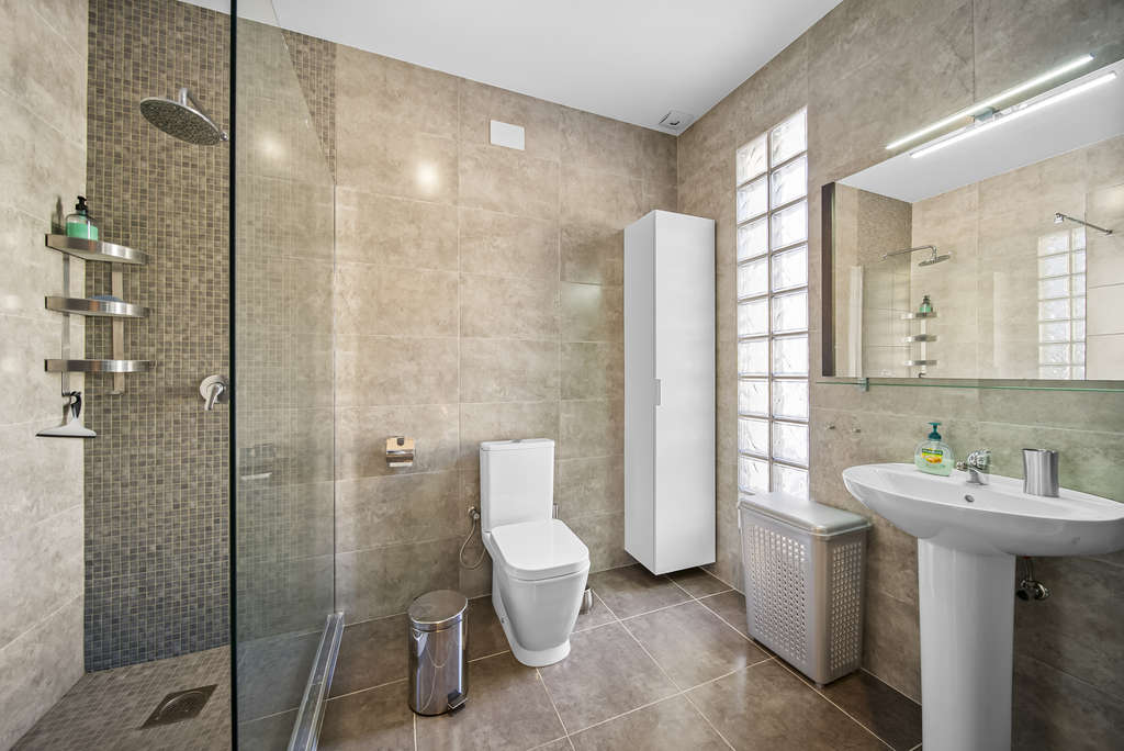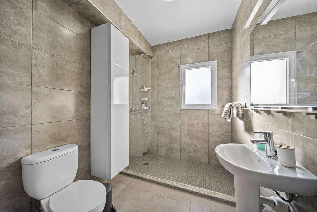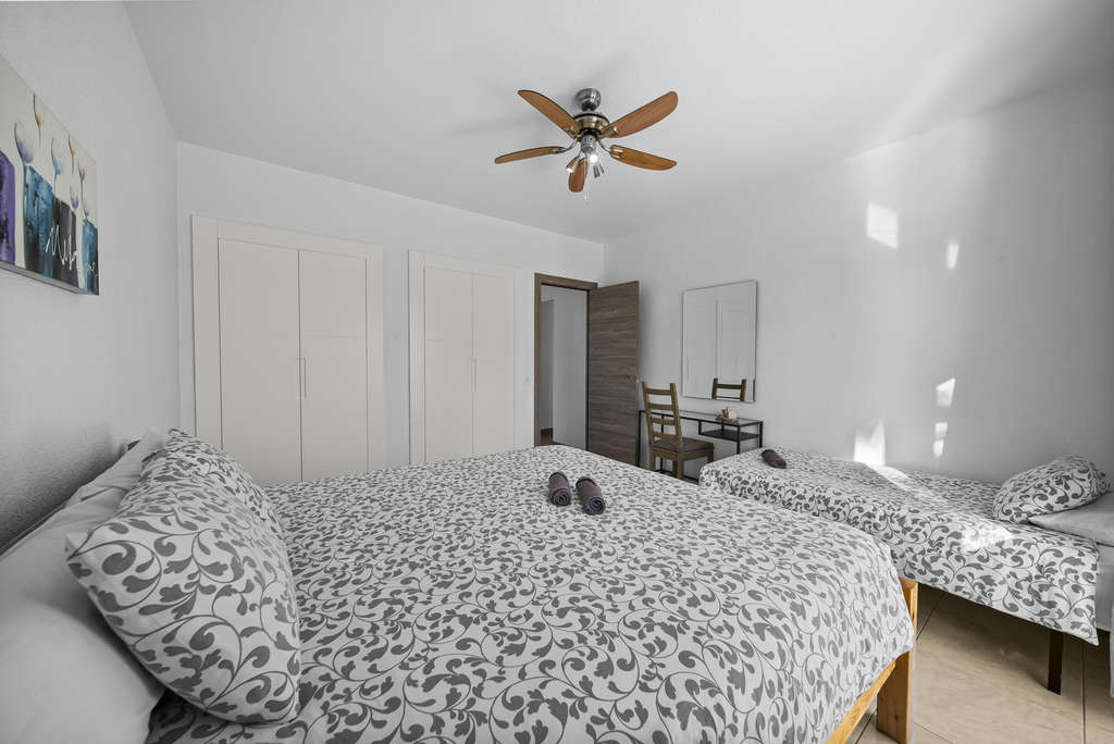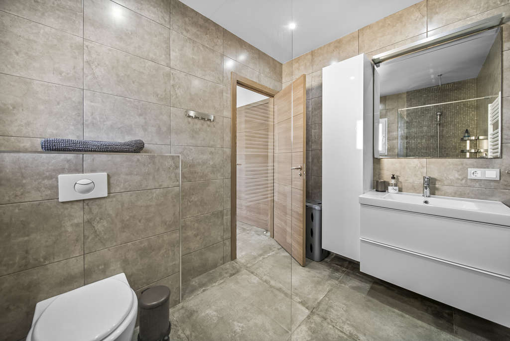 En la planta superior, con entrada totalmente independiente, se encuentra un apartamento privado con su propio salón comedor, cocina abierta, dos dormitorios, un baño completo y dos generosas terrazas con vistas despejadas. Una solución perfecta para invitados o incluso como alojamiento turístico.