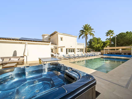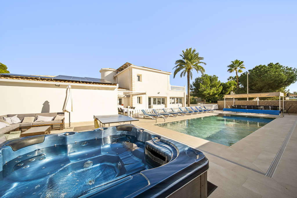 El exterior de la propiedad es una verdadera joya: un jardín muy bien cuidado, varias zonas de sombra con pérgolas, espacios chill out, una espectacular piscina privada con jacuzzi y aparcamiento dentro de la parcela para varios vehículos.