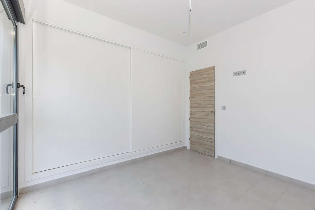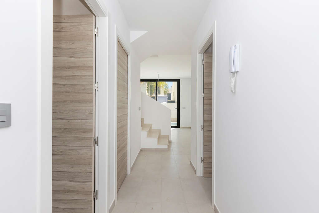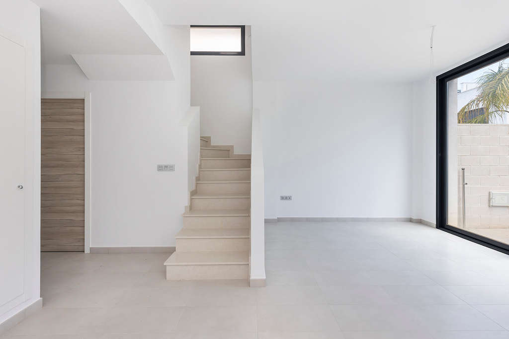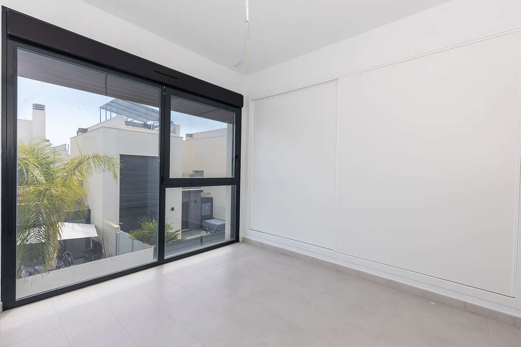 Moderna villa de 3 dormitorios y 2 baños. La vivienda se distribuye en 2 plantas, en planta baja encontraremos un salón-comedor con cocina americana, 1 dormitorio y 1 baño. En planta alta encontraremos 2 dormitorios, un baño y una terraza. La vivienda también cuenta con un amplio solárium de 37m2. La villa también tiene piscina privada y entrada privada para el coche.