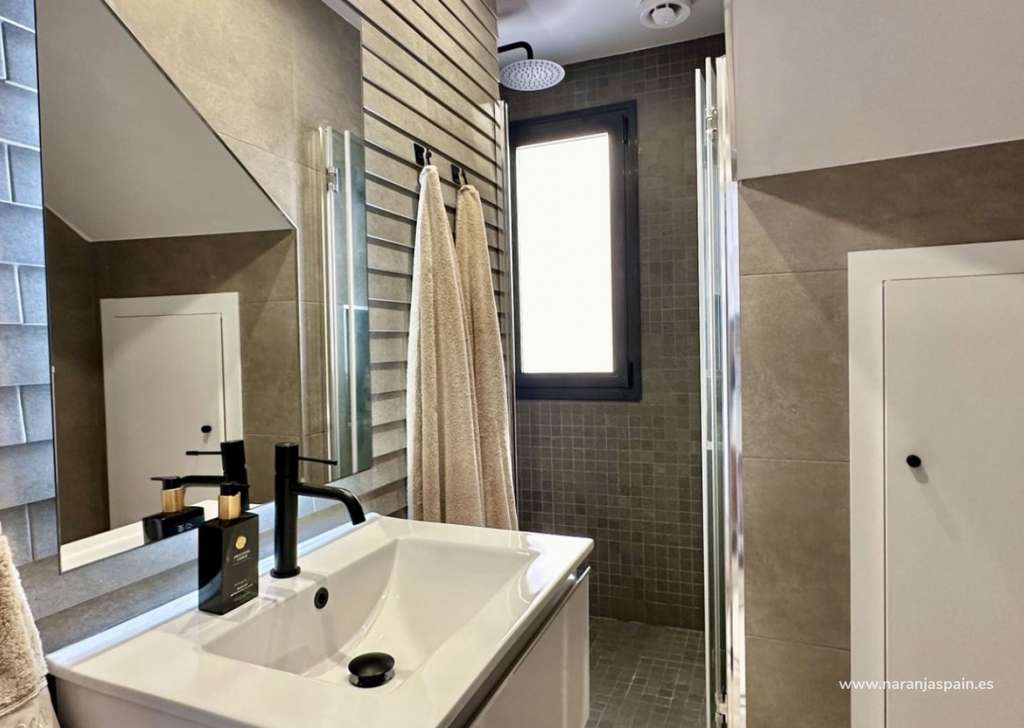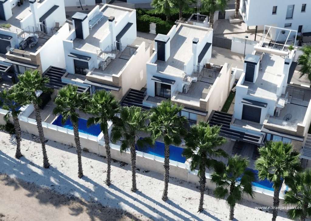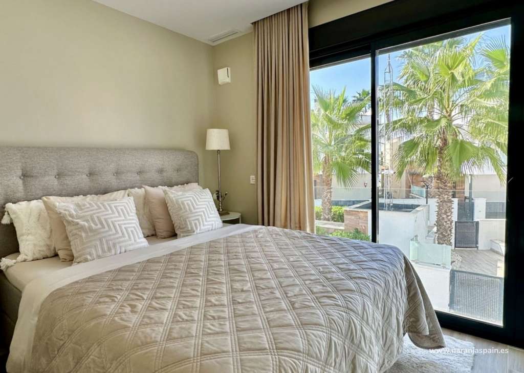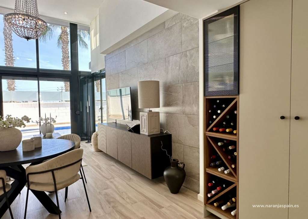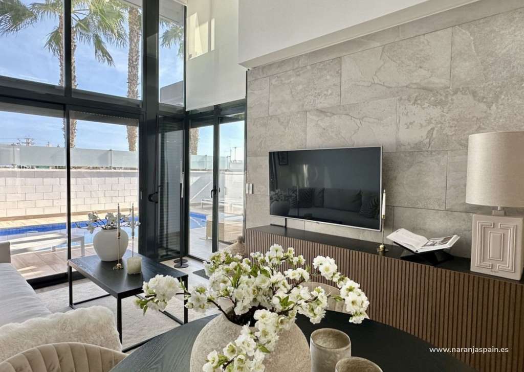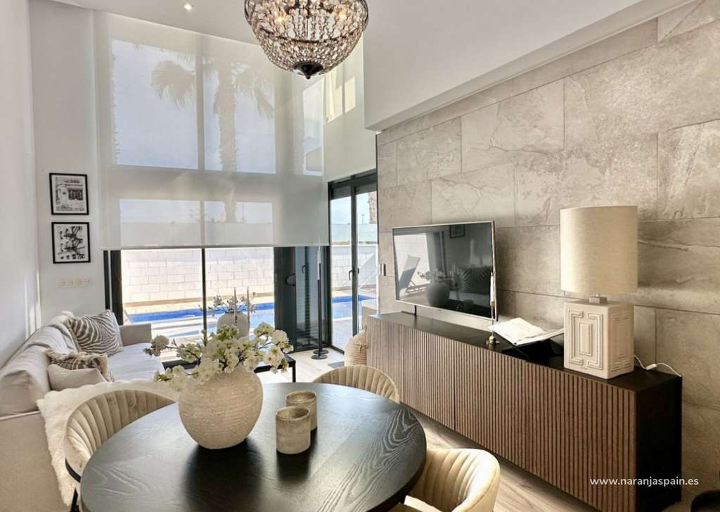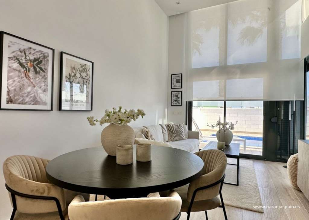 La villa se distribuye en dos niveles con 130 m² de superficie habitable. Dispone de un salón-comedor de planta abierta, una cocina contemporánea totalmente equipada y tres amplios dormitorios, dos de ellos con baño en suite. Todos los dormitorios cuentan con armarios empotrados y mucha luz natural.