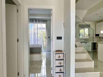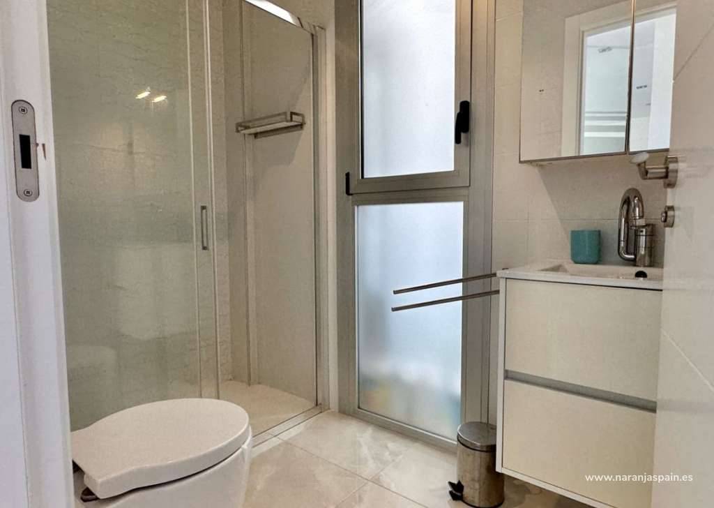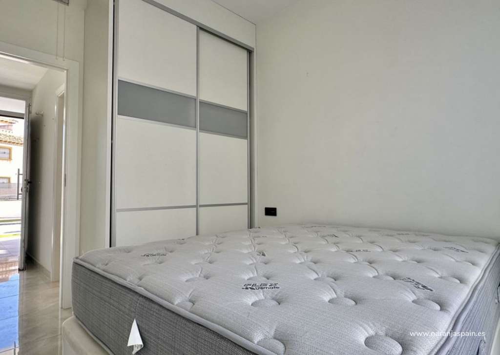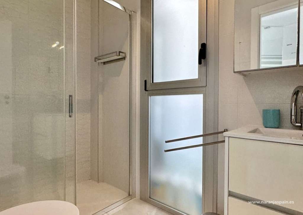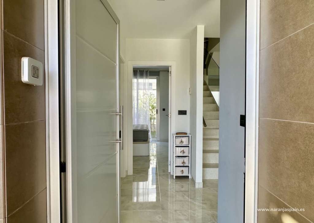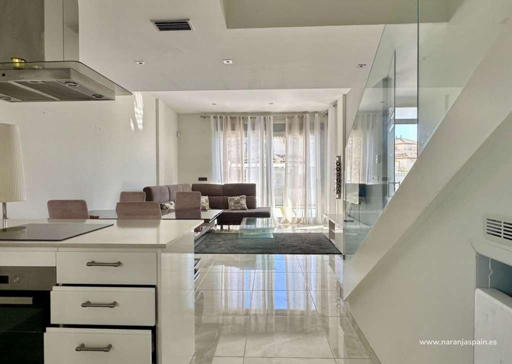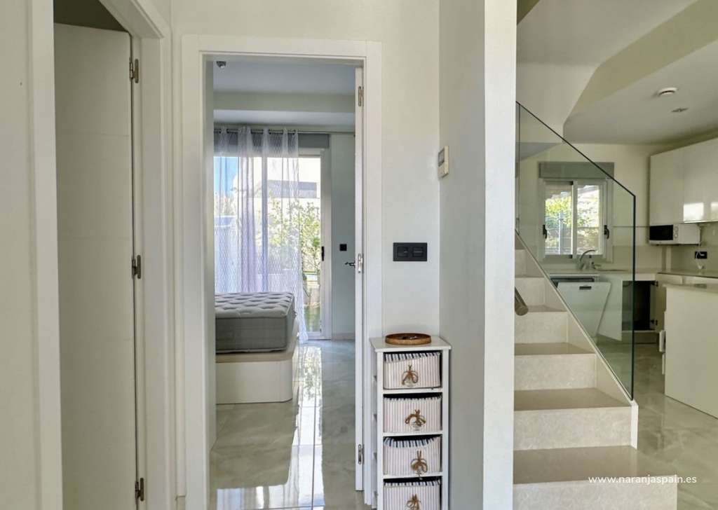 La planta baja cuenta con un salón luminoso con suelo radiante, cocina totalmente equipada y un dormitorio con baño independiente. En la planta superior se encuentran dos amplios dormitorios, cada uno con su baño en suite, además de una terraza acristalada con vistas al mar.