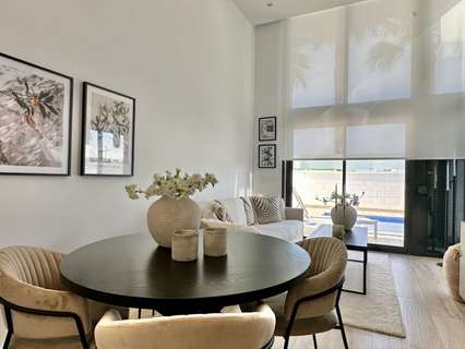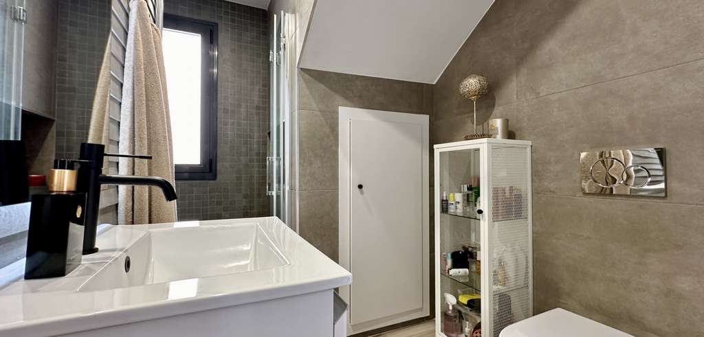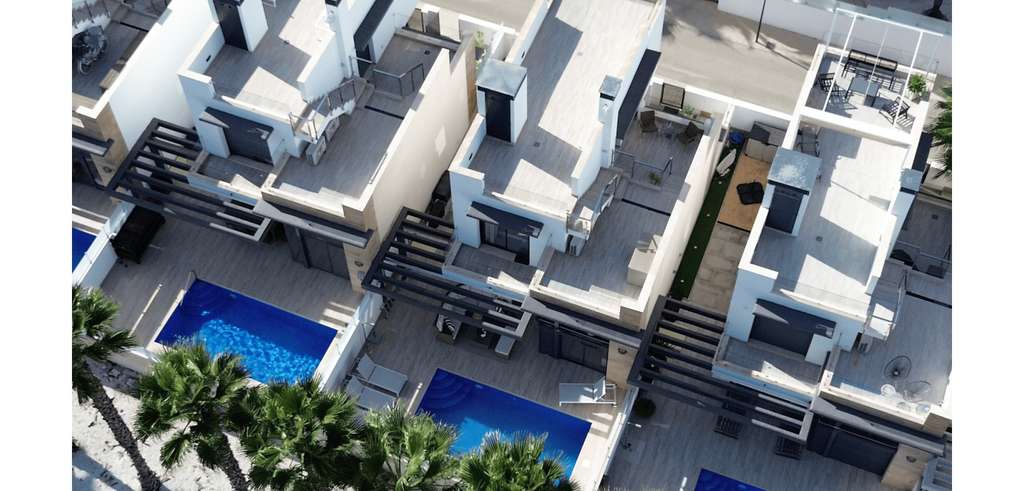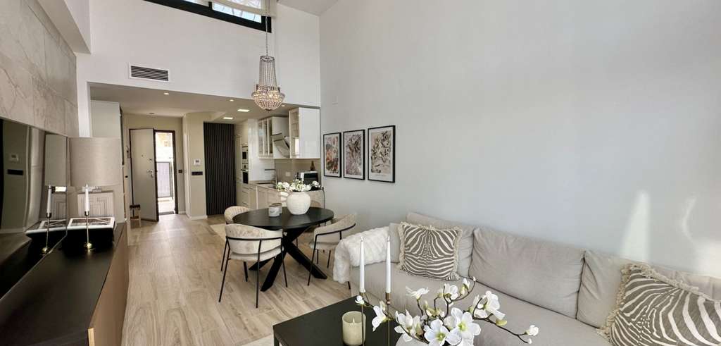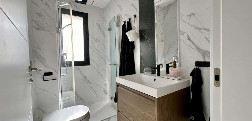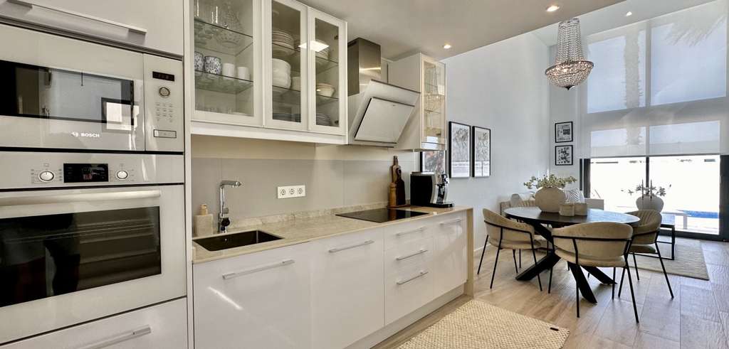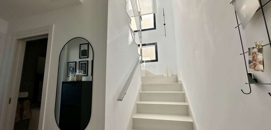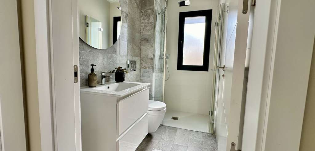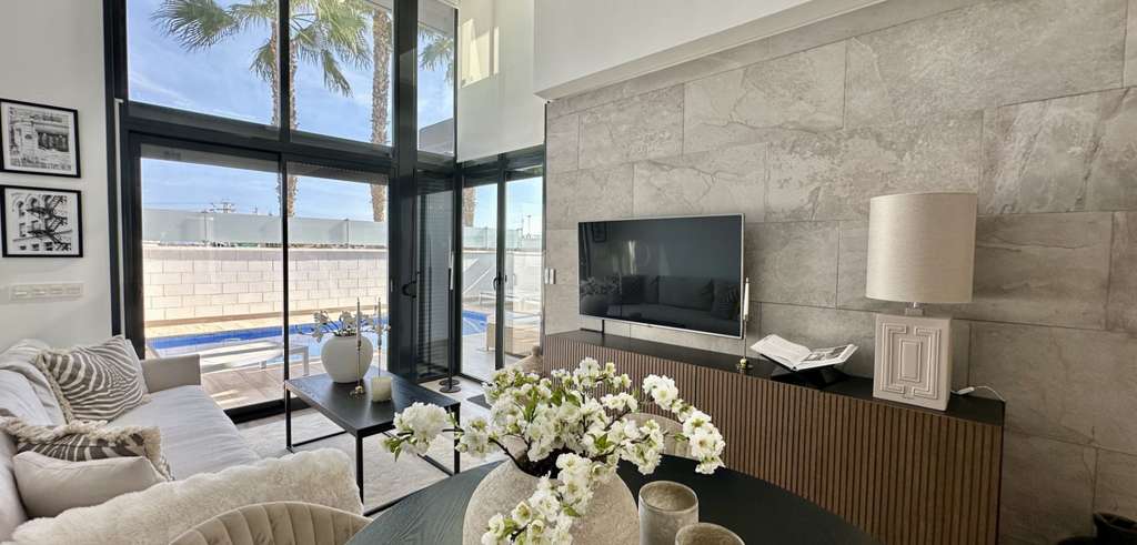 La villa se distribuye en dos niveles con 130 m² de superficie habitable. Dispone de un salón-comedor de planta abierta, una cocina contemporánea totalmente equipada y tres amplios dormitorios, dos de ellos con baño en suite. Todos los dormitorios cuentan con armarios empotrados y mucha luz natural.