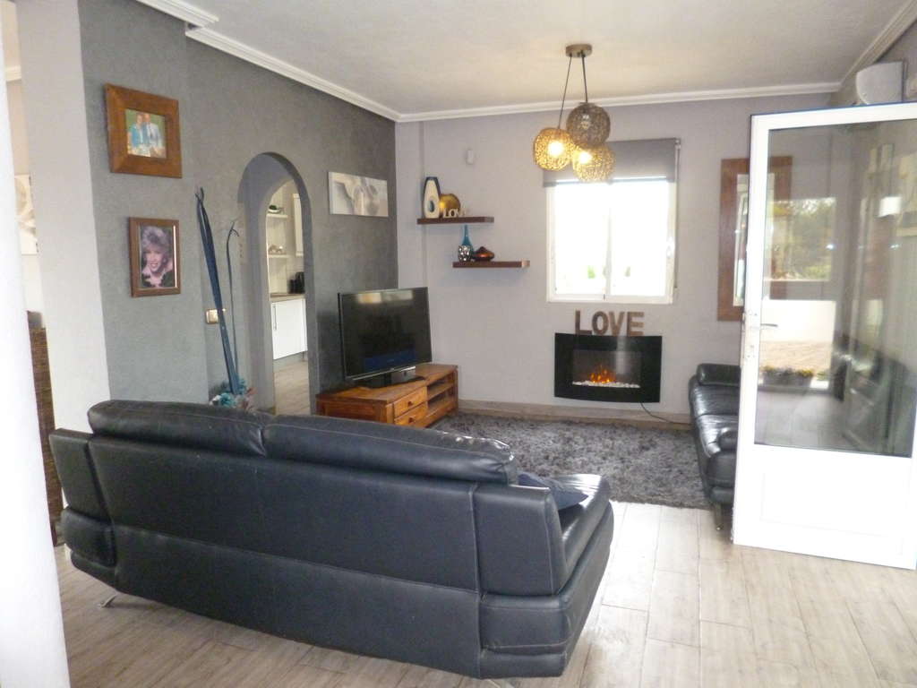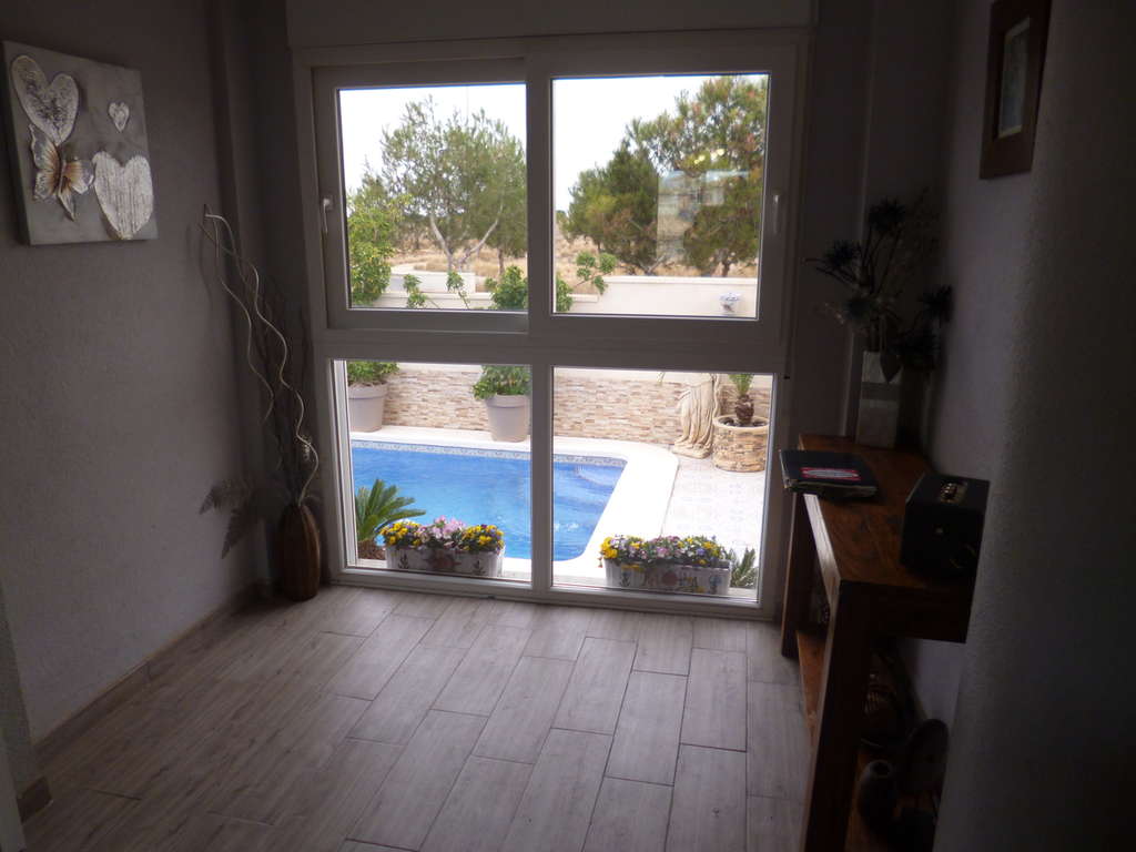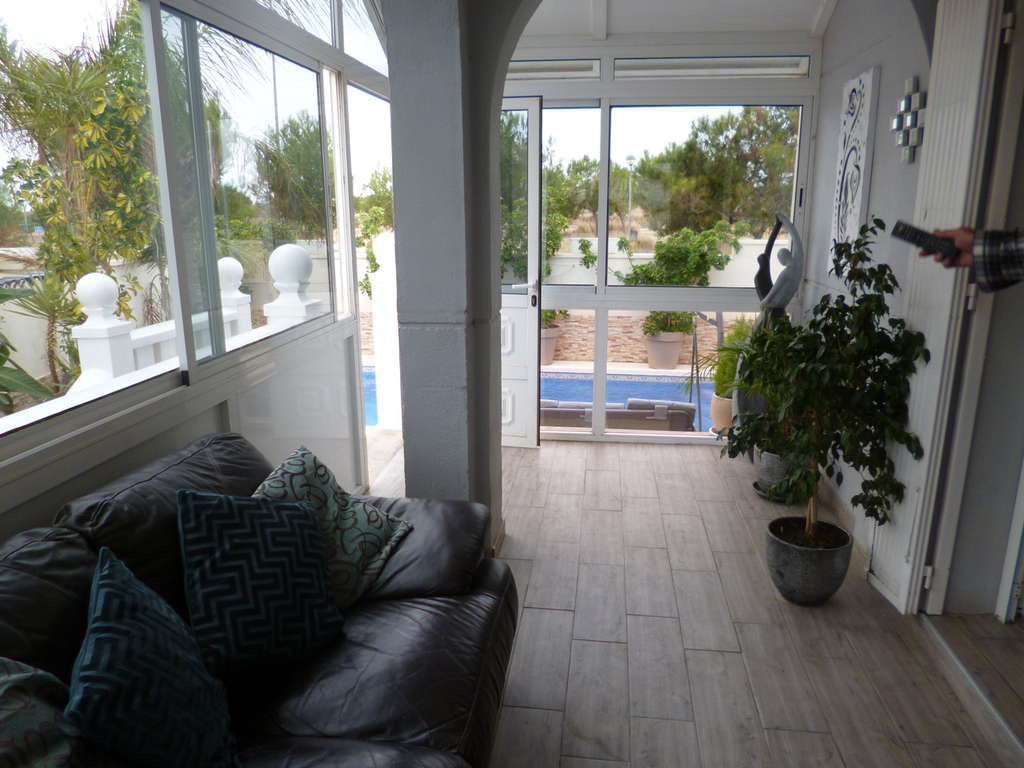 Una hermosa villa en San José con 4 dormitorios, 3 baños y piscina privada en Playa Flamenca, entre el Boulevard La Zenia y el popular mercado de los sábados. La villa ha sido reformada y redecorada con un alto nivel de calidad. En la parte delantera hay aparcamiento privado con zona de estar. El jardín es de bajo mantenimiento, con plantas en macetas y mayormente embaldosado. Las puertas del patio dan al apartamento/anexo de la planta baja con dos dormitorios, baño, cocina moderna equipada, lavadero y salón. Las escaleras desde la entrada principal conducen al jardín trasero y a la piscina, con acceso al edificio principal. Un invernadero con zona de estar con vistas a la piscina, el salón con chimenea de gas y el comedor con salida a una zona de estar con vistas al jardín y a la piscina. Un aseo con ducha y una cocina moderna equipada se encuentran junto al salón. Una puerta da acceso al anexo de la planta baja y un arco a los dormitorios y al solárium de la planta superior. Los dos dormitorios tienen ventiladores de techo y aire acondicionado; el dormitorio principal cuenta con vestidor y zona de estar, con vistas al parque y al área de juegos infantiles. La planta superior es el solárium, con su antena parabólica y vistas a los alrededores y al centro comercial La Zenia Boulevard.