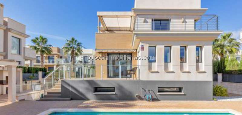 Esta villa está situada en un residencial exclusivo y tiene su propia piscina privada y una parcela de 410m2. La vivienda cuenta con 250m2 construidos divididos en 4 plantas. En planta baja encontramos un amplio salón con cocina americana, 1 dormitorio, 1 baño y terraza con con salida a la piscina. En planta semi-sótano encontramos un salón con cocina americana, 2 dormitorios y 1 baño. Además esta planta cuenta con sauna y ducha. En planta primera encontramos 2 dormitorios, cada uno tiene uno baño en-suite y una amplia terraza. En la planta superior hay un amplio solarium de 46m2.