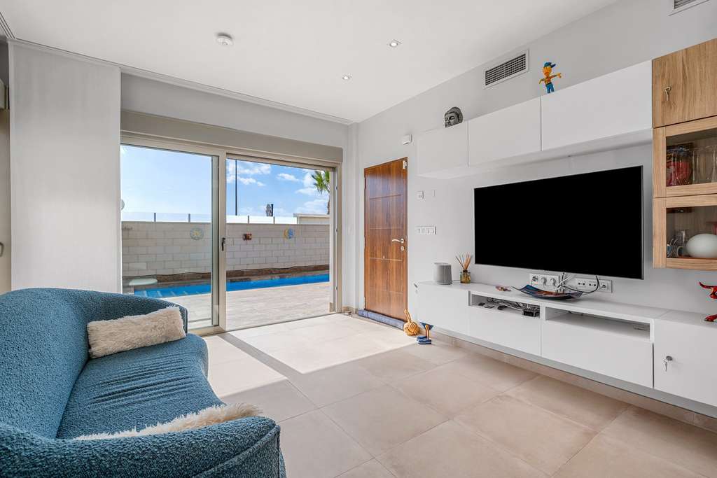 La villa ofrece tres amplios dormitorios dobles, todos con armarios empotrados y baño en suite. En el exterior, podrás disfrutar de un jardín cuidadosamente diseñado con una piscina privada de 6 x 2,25 m, equipada con sistema de calefacción para usarla durante todo el año.