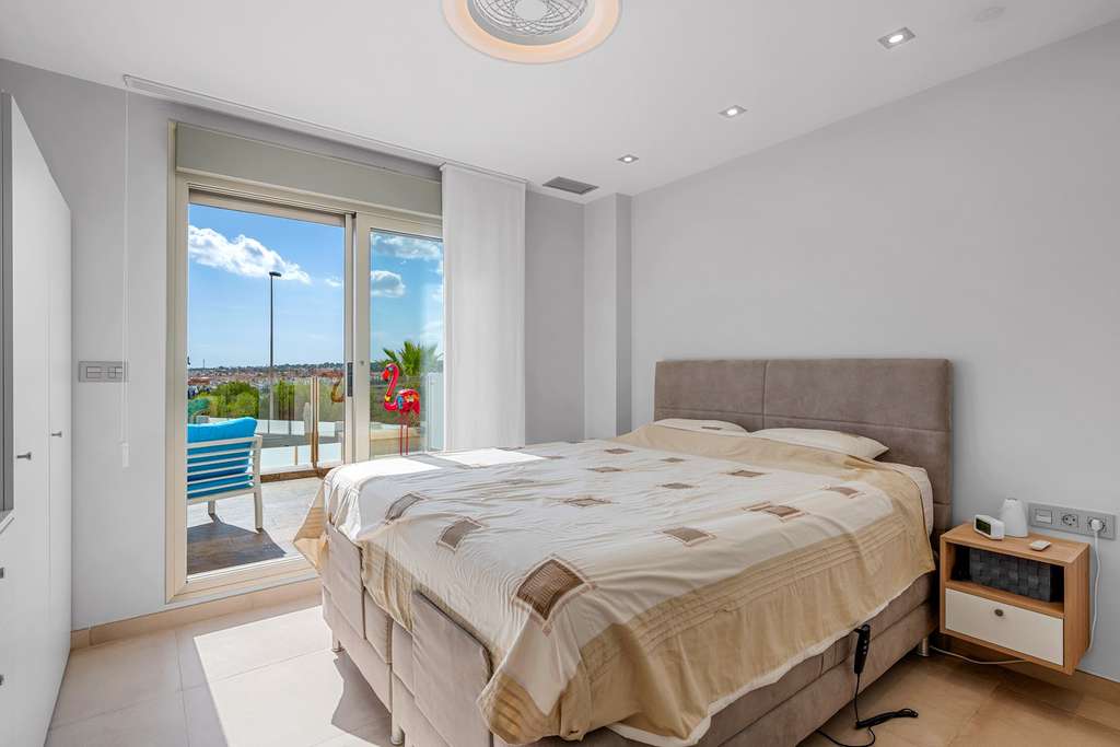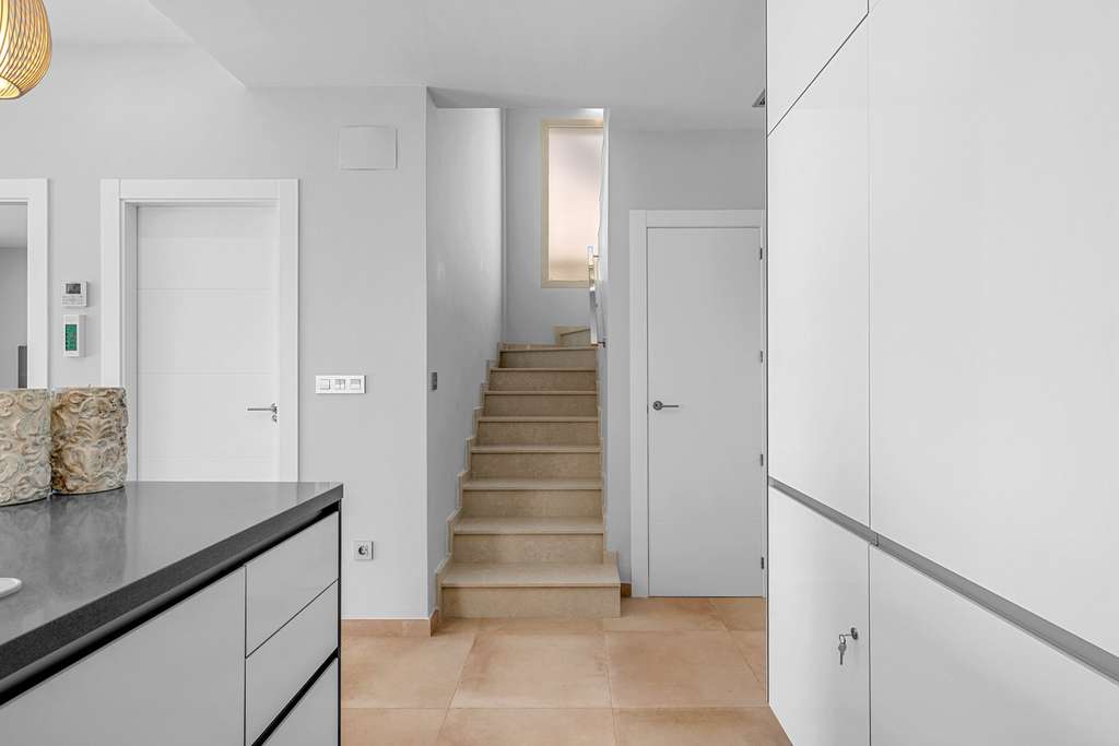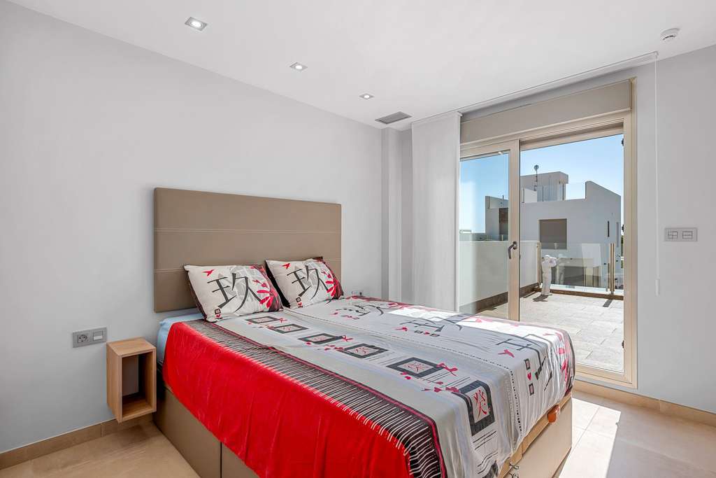 En la planta superior se encuentran dos de los tres dormitorios, ambos con acceso a una magnífica terraza de 22 m², perfecta para relajarse y disfrutar de los atardeceres y la naturaleza que caracterizan a Orihuela Costa.