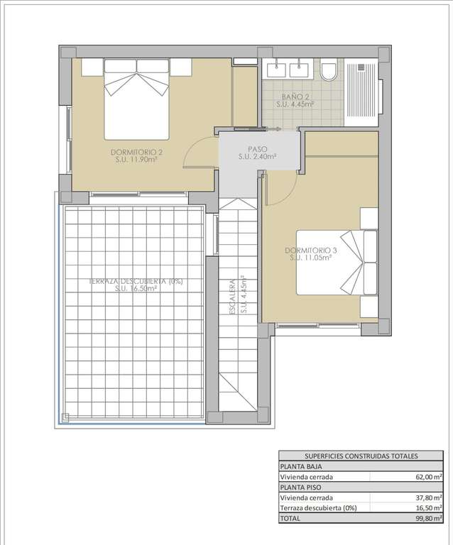 Cada villa está diseñada con una distribución contemporánea en dos plantas, con 3 dormitorios y 2 baños. La primera planta cuenta con una terraza descubierta y hay un solárium en la azotea disponible con un coste adicional.