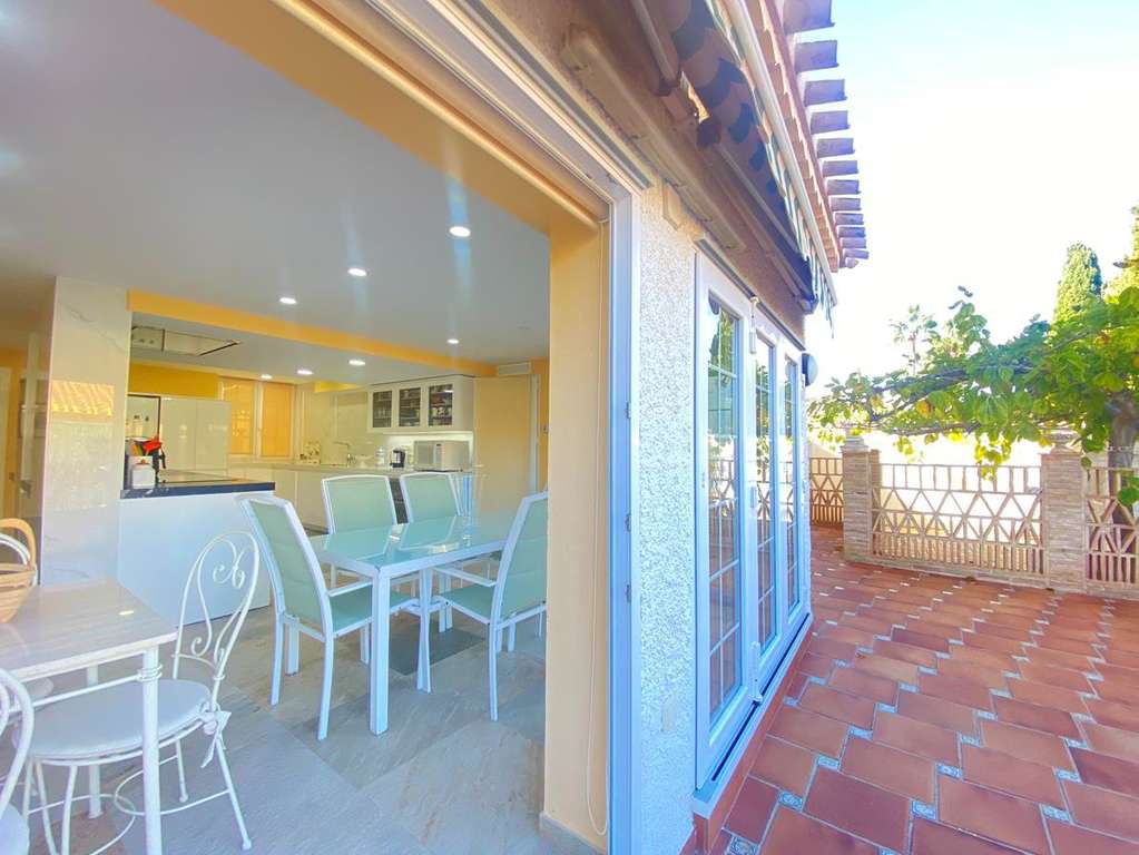 La cocina, completamente reformada, es otro de los grandes atractivos de esta villa. Con un diseño moderno y funcional, cuenta con una gran isla central, abundante espacio de almacenamiento y zona de comedor. Además, desde la cocina se accede a un amplio patio trasero, ideal para comer al aire libre, así como a una despensa y al garaje privado.