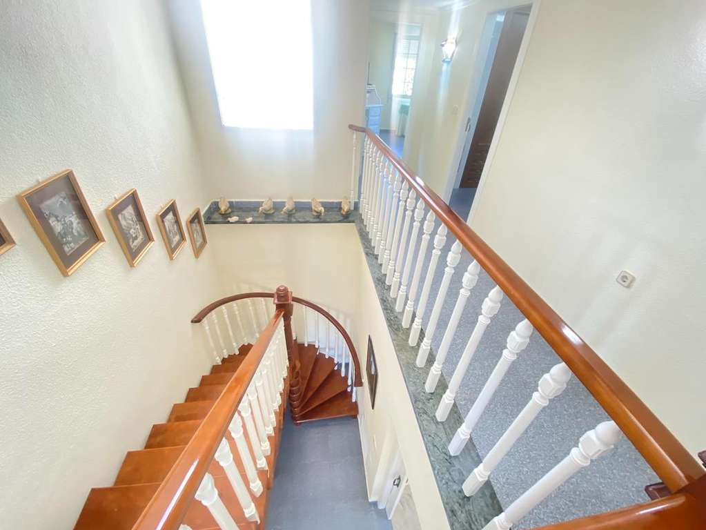 Una elegante escalera de madera conduce a la planta superior, donde se encuentran seis dormitorios adicionales y tres baños. Uno de los baños es en suite, y varios dormitorios tienen acceso a una terraza privada, donde podrás disfrutar de impresionantes vistas y de la brisa marina.