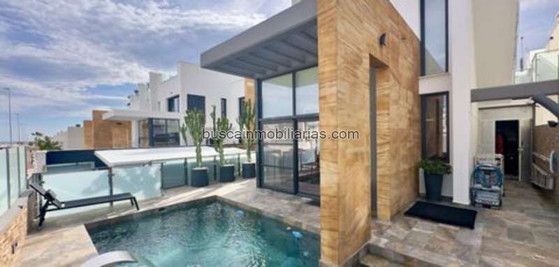 Magnífica villa independiente reformada en Lomas de Cabo Roig (Orihuela Costa), ubicada en una parcela de 197 m2 y equipada con todas las comodidades.~~La vivienda se distribuye en dos plantas más solárium. En la planta baja ofrece un amplio y luminoso salón-comedor con cocina americana y grandes ventanales con vistas a la piscina privada con cascada, además de un dormitorio y un baño con ducha. ~En la primera planta cuenta con dos dormitorios dobles y dos baños completos con suelo radiante. ~En la planta alta se disfruta de un espectacular solárium con vistas al mar, perfecto para relajarse durante todo el año. ~~La propiedad dispone de placas solares, trastero y parking dentro de la parcela. Ubicada en una zona tranquila y bien comunicada, esta villa es una oportunidad única para quienes buscan confort, privacidad y estilo en la Costa Blanca.~~Orihuela Costa es una de las zonas más atractivas de la Costa Blanca, conocida por sus playas de aguas cristalinas, su clima mediterráneo y su ambiente tranquilo pero con todos los servicios a mano. Cuenta con calas y playas con Bandera Azul, centros comerciales como La Zenia Boulevard, una amplia oferta de restaurantes y zonas de ocio, además de prestigiosos campos de golf. Con excelentes conexiones y un entorno ideal para vivir o disfrutar de vacaciones, Orihuela Costa combina calidad de vida, naturaleza y comodidad.