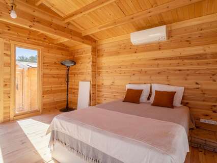 Casa de huéspedes de madera (50 m²) con dormitorio, terraza y terraza cubierta con cocina y comedor.