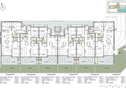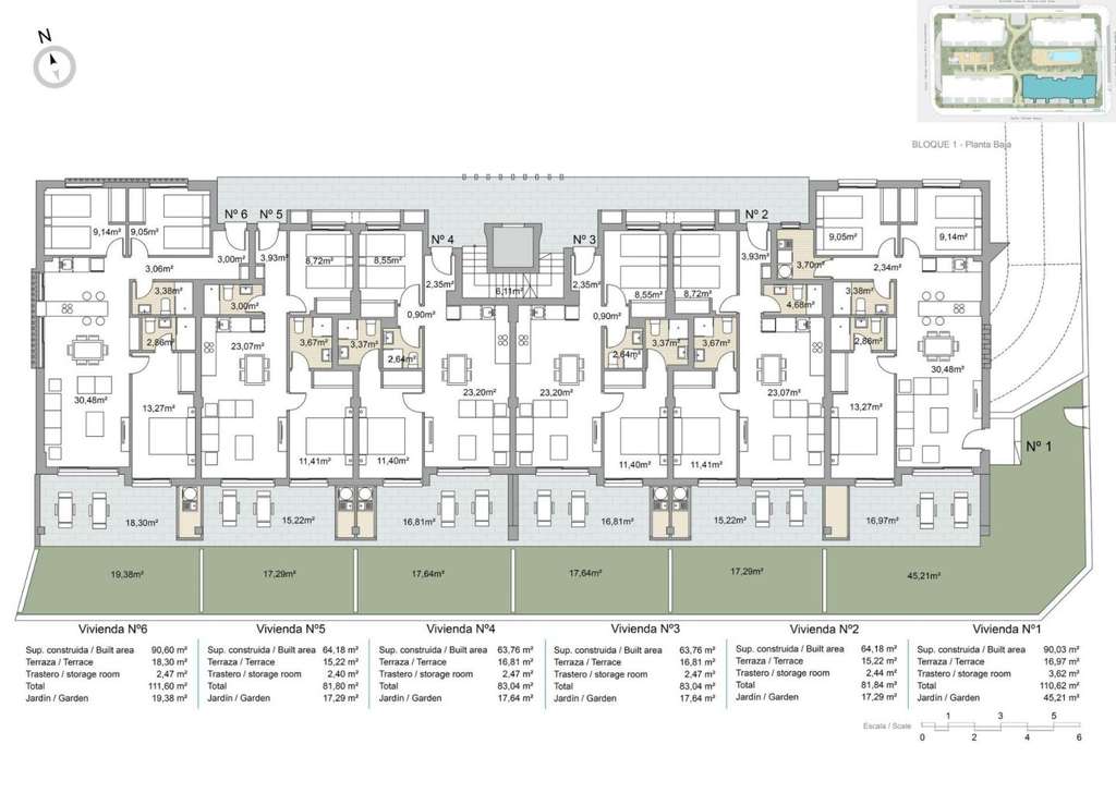 Apartamentos en planta baja con jardín privado, apartamentos en planta media con amplias terrazas y áticos en planta alta con solarium privado.
