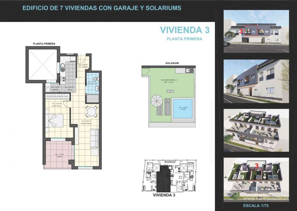 Primera planta: Cuatro apartamentos de 1 ó 2 dormitorios, cada uno con solárium individual.