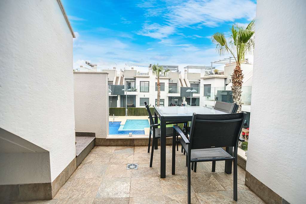 En la parte delantera del espacio habitable también tiene una amplia terraza delantera con vistas a las piscinas comunitarias.