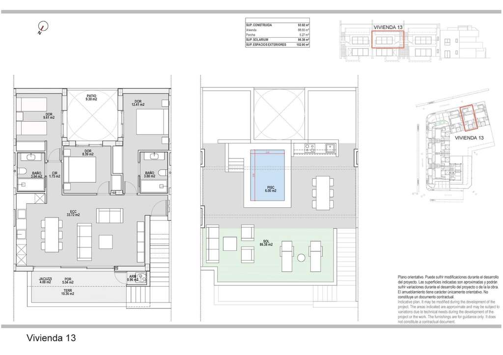 Los bungalows de la planta superior incluyen una amplia terraza y un solárium privado en la azotea. El solárium cuenta con una cocina de verano y ofrece la opción de añadir una piscina privada o un jacuzzi con un coste adicional, lo que lo convierte en un espacio ideal para relajarse mientras se disfruta del cálido clima mediterráneo y de las vistas panorámicas.