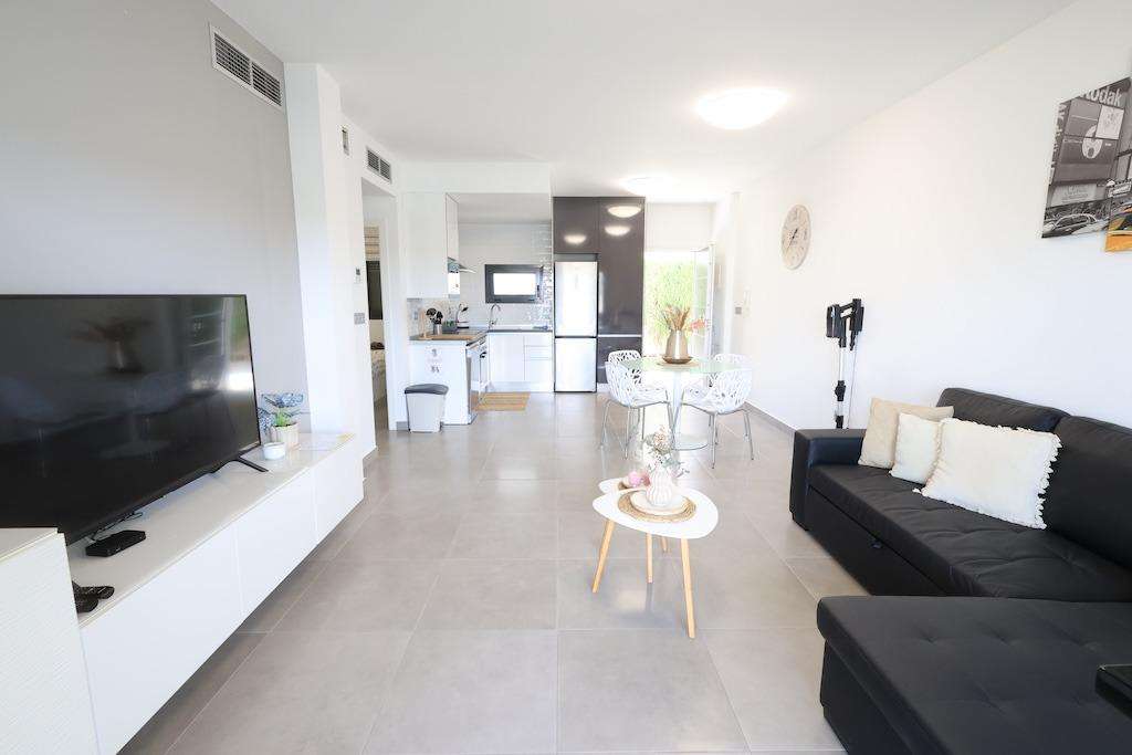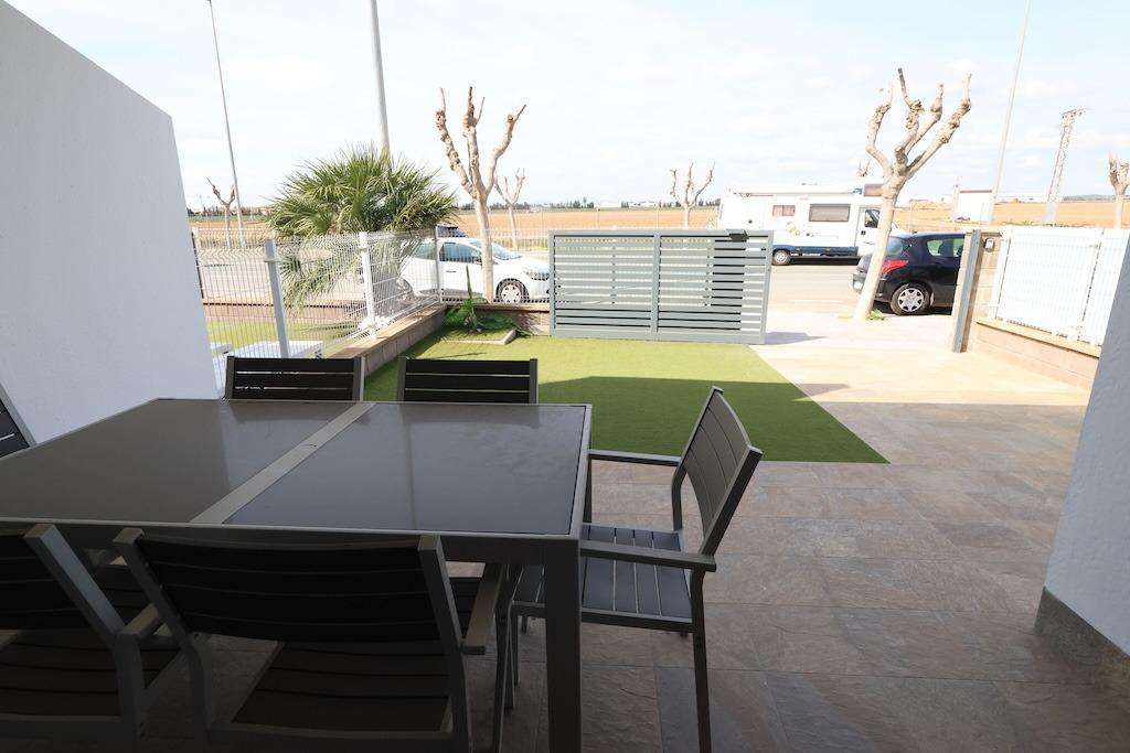 La Mar Fase III, Pilar de la Horadada, Bungalow en planta baja de 70 m2 con 2 dormitorios, 1 baño, amplio salón comedor con cocina incorporada al salón, terraza y un jardin enlosado de 30 m2 con entrada para el coche, la vivienda se vende amueblada con aire acondicionado central por conductos, el residencail cuenta con piscina comunitaria.