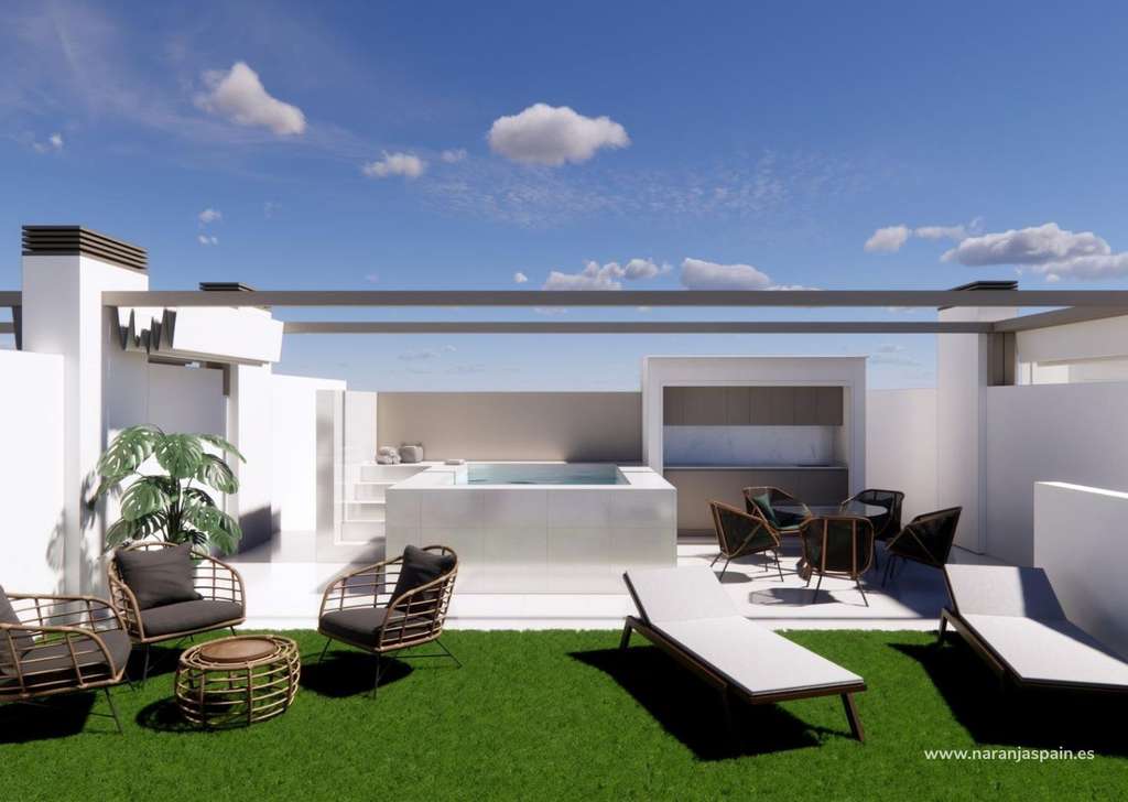 Los bungalows de la planta superior incluyen una amplia terraza y un solárium privado en la azotea. El solárium cuenta con una cocina de verano y ofrece la opción de añadir una piscina privada o un jacuzzi con un coste adicional, lo que lo convierte en un espacio ideal para relajarse mientras se disfruta del cálido clima mediterráneo y de las vistas panorámicas.