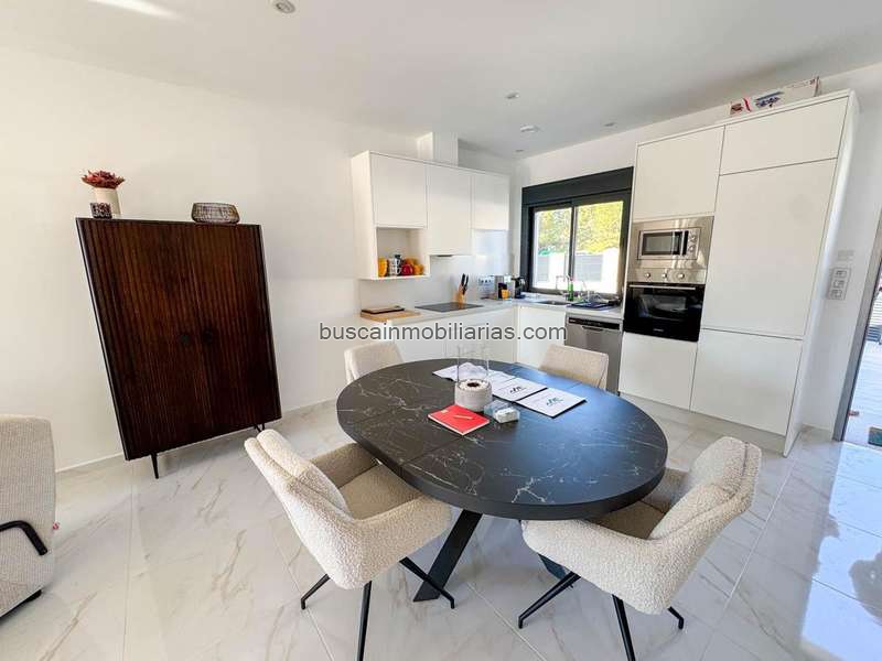 El interior presenta un diseño contemporáneo con suelos de gres de gran formato, cocina totalmente amueblada con encimera de cuarzo, armarios empotrados y baños equipados con piezas de porcelana de primera calidad. Además, dispone de una instalación eléctrica moderna con videoportero, iluminación interior y exterior, y preinstalación para motorización de persianas.