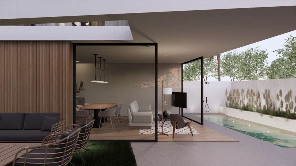Cada villa es una obra maestra arquitectónica, con una piscina individual que se convierte en el epicentro de la relajación y el entretenimiento en tu propio hogar. Imagina disfrutar de días soleados en tu solarium privado, donde el gres porcelánico imitación madera crea una estética cálida y acogedora. Tanto la parcela como el solarium están adornados con césped artificial, proporcionando un toque de frescura y fácil mantenimiento.