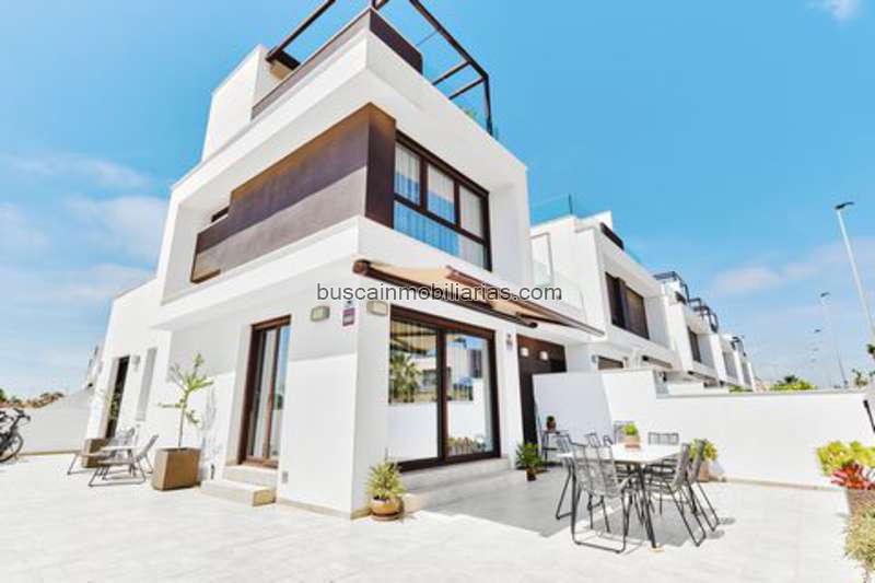 We are excited to present to you this incredible villa in the sought after costal town of Torre de la Horadada. Built originally by a renowned excellent builder Zapata This stunning modern semi detached villa offers a huge private wrap around patio terrace, private solarium complete with summer kitchen, various balconies and a luxurious communal area complete with jacuzzi, children’s pool, children’s playground and a larger pool with plenty of space for everyone to enjoy. The property features an open plan kitchen/living and dining area, one bedroom and a bathroom on the ground floor. Two further bedrooms, a bathroom are located on the first floor and access to a private terrace from the master bedroom. On the third floor of this magnificent villa is an enormous roof top solarium with summer kitchen and with covered terrace. This property simply oozes quality, from its Mogal kitchen with special integrated appliances to its cleverly designed skirting draws, Mogal bathroom cupboards, soft water filter, electric sun blinds, electric shutters, extra exterior lights, fully fitted air conditioning and much more. Set within walking distance to both the beach as well as many local amenities. Community fees: 50 a month approximately.