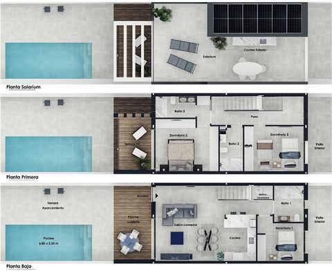 Descripción del objeto: Adosados que constan de una superficie construida de unas 195 m² - 270 m² (incluyendo terrazas) con 3 dormitorios, 3 baños (1 en-suite), 1 salón / comedor con cocina, 1 patio (a unos 15 m² - 16 m²), 1 terraza en planta baja (a unos 20 m² - 79 m²), 1 terraza en planta primera (a unos 3 m² - 8 m²) y 1 solario (a unos 36 m² - 39 m²). Este conjunto residencial se caracteriza por sus 8 villas adosadas, de 3 dormitorios y 3 baños y ofreciendo comodidad y estilo. Los interiores, elegantes y funcionales, cuentan con cocinas totalmente equipadas incluyendo electrodomésticos y disponen de preinstalación de climatización por conductos e instalación de paneles fotovoltaicos para un ahorro de energía. Equipamiento adicional: Las viviendas poseen los estándares de calidad más altos y están equipadas con: - Piscina privada. - Cocina completamente amueblada y equipada con electrodomésticos. - Videoportero - Persianas motorizadas - Iluminación LED dentro de la vivienda y en áreas exteriores. - Armarios emprotados. - Cuartos de baño totalmente equipados con tocador, inodoro, espejo y ducha. - Preinstalación de aire acondicionado por conductos. - Cocina de verano en solárium. - Plaza de aparcamiento. Ubicación de casa/solar: El complejo está situado en las afueras de Pilar de la Horadada, a tan sólo 4 km de la maravillosa playa de arena. Todos los servicios se encuentran en Pilar de la Horadada y en los cercanos pueblos de San Pedro de Pinatar y San Javier. Merece la pena visitar la capital de la provincia, la ciudad de Murcia, que se alcanza cómodamente en coche. Allí un atractivo casco antiguo, un gran número de iglesias, una catedral impresionante, pequeñas y pintorescas plazas así como varias zonas peatonales con boutiques, bares y restaurantes invitan a dar un paseo. Otros: Calificación energética está pendiente.
