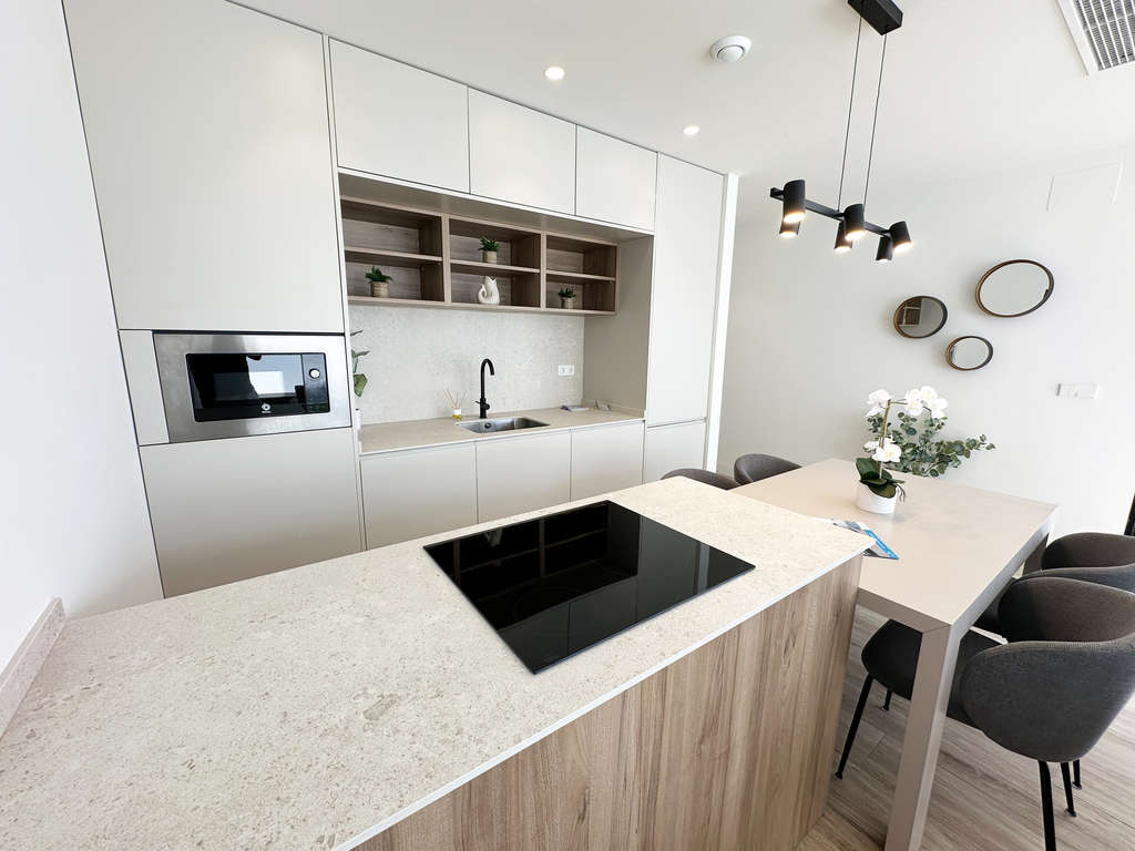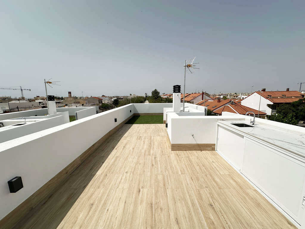 En la planta baja encontrará uno de los dormitorios, un baño y el amplio salón con cocina abierta. En el primer piso encontrará 2 dormitorios más y 2 baños, uno de ellos en suite. En todas las villas, el dormitorio principal también dispone de terraza privada en esta planta. Cada villa también tiene una amplia azotea de 50m2 con vistas al mar. Las villas también cuentan con cocina totalmente terminada con todos los electrodomésticos, instalación completa de aire acondicionado, baños completamente terminados, armarios empotrados y persianas eléctricas.