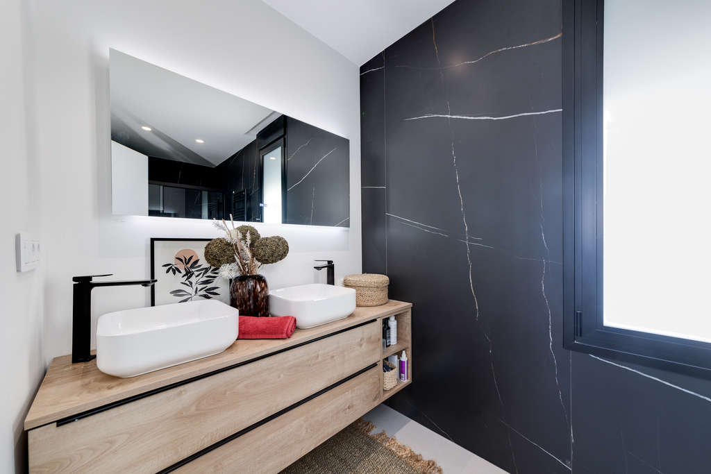 INTERIORES El interior de las villas en Pilar de la Horadada está diseñado para ofrecer espacios amplios y luminosos, con una distribución que maximiza la funcionalidad y el confort. Cada villa cuenta con 3 dormitorios dobles con armarios empotrados, 2 baños modernos y un aseo adicional para mayor comodidad. La cocina americana, equipada con electrodomésticos de alta calidad, se integra perfectamente con el salón, creando un espacio abierto y diáfano ideal para la vida diaria y el entretenimiento. Los grandes ventanales permiten la entrada de abundante luz natural, creando un ambiente acogedor y luminoso en toda la vivienda. Con una superficie construida de 122 m² y útil de 100 m², estos interiores están diseñados para ofrecer una experiencia de vida cómoda y moderna. Los acabados de alta calidad y la atención al detalle aseguran que cada villa sea tanto funcional como estéticamente atractiva.