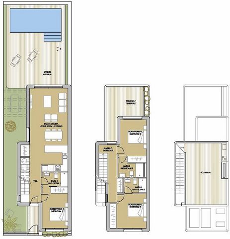 Descripción del objeto: Muy bonitos chalets que constan de una superficie construida de unas 173 m² (terrazas incluidas) con 3 dormitorios, 3 baños (2 en-suite), 1 salón / comedor con cocina moderna, 1 terraza en planta primera (a unos 15 m²) y 1 solario (a unos 27 m²). Las parcelas tienen un tamaño de 264 m². Este complejo de 12 villas es un residencial concebido para disfrutar del clima mediterráneo. Para ello cada villa dispone de magníficas terrazas, solárium y un preciosos jardín con piscina de diseño. Con una orientación inmejorable, cerca de la playa y dentro de una urbanización consolidada que cuenta con instalaciones deportivas y zonas de ocio. Las viviendas cuentan con amplias estancias distribuidas en 2 plantas. En la planta baja, vinculada al jardín, nos encontramos con un luminoso salón-comedor más cocina así como dormitorio de matrimonio y baño. En la planta primera hay otros 2 dormitorios dobles cada uno con su propio baño. Un fantástico solárium remata el conjunto en la planta cubierta. Mil Palmeras está situada en una zona privilegiada de Torre de la Horadada. Su tranquilidad así como la cercanía a la playa y a todo tipo de servicios hace de ella un enclave inmejorable. Equipamiento adicional: El equipamiento de alta calidad de las viviendas incluye puertas de seguridad, ventanas de PVC con doble cristal y persianas, preinstalación de aire acondicionado, cocinas completamente amuebladas (sin electrodomésticos), armarios empotrados en dormitorios, tomas de teléfono y televisión en el salón y todos los dormitorios, suelo radiante en baños, placas fotovoltaicas para producción de energía eléctrica, preinstalación sistema de alarma y mucho más. Ubicación de casa/solar: La urbanización está situada a tan sólo 1 km de la maravillosa playa de Mil Palmeras, donde hay bares, restaurantes y tiendas pequeñas. Muy cerca se puede encontrar también todo tipo de servicios, como consultorios médicos, sucursales bancarias, supermercados y una gran variedad de comercios especializados. Al aeropuerto de Alicante pueden llegar en unos 45 minutos en coche. Otros: Calificación energética está pendiente.