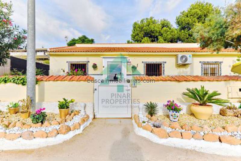 Great opportunity to purchase a 3 bedroom, 2 bathroom country property located in rural surroundings near the popular and busy town of Pilar de la Horadada with a large selection of amenities including several large supermarkets, sports facilities with indoor heated swimming pool, 24 hour medical centre and numerous bars and restaurants. The entrance to the plot is via a gate into a patio area and the front door of the property, the door opens into a good sized entrance hall. To both sides of the entrance hall are doors which lead into the second and third bedrooms, both are good sized doubles and are nice and bright with windows looking out to the front patio. A hallway leads from the entrance into a central dining room, to the left hand side is the large family bathroom and a separate shower room also used as a utility. Straight ahead from the dining area is the separate kitchen which is a good size with plenty of storage space. To the right hand side of the dining area is the cosy living room with pellet burner and a doorway from the rear of the living area leads to the master bedroom. There has been a wraparound sun room added which can accessed from the living room or from a hallway next to the kitchen, this sunroom opens up the living room and floods it with natural light. The sunroom has door leading out onto a courtyard garden which is large and has space for a private swimming pool, the space is surrounded by high walls for privacy and there is a brick built storage space. This property also comes with a garage and some additional land which is situated just across the road from the property. This villa is well presented and requires no work, viewing is highly recommended.