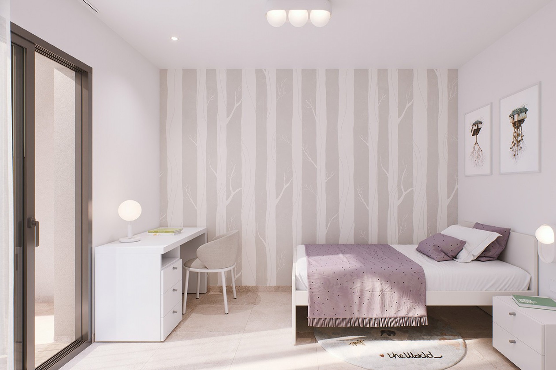 La planta superior alberga los otros dos dormitorios y un segundo baño. Finalmente, en la parte más alta de la vivienda, el amplio solárium ofrece un espacio versátil con preinstalación para cocina de verano, perfecto para instalar una zona chill-out, barbacoa o incluso un jacuzzi. Opcionalmente, se puede construir una habitación adicional con baño o una piscina elevada.