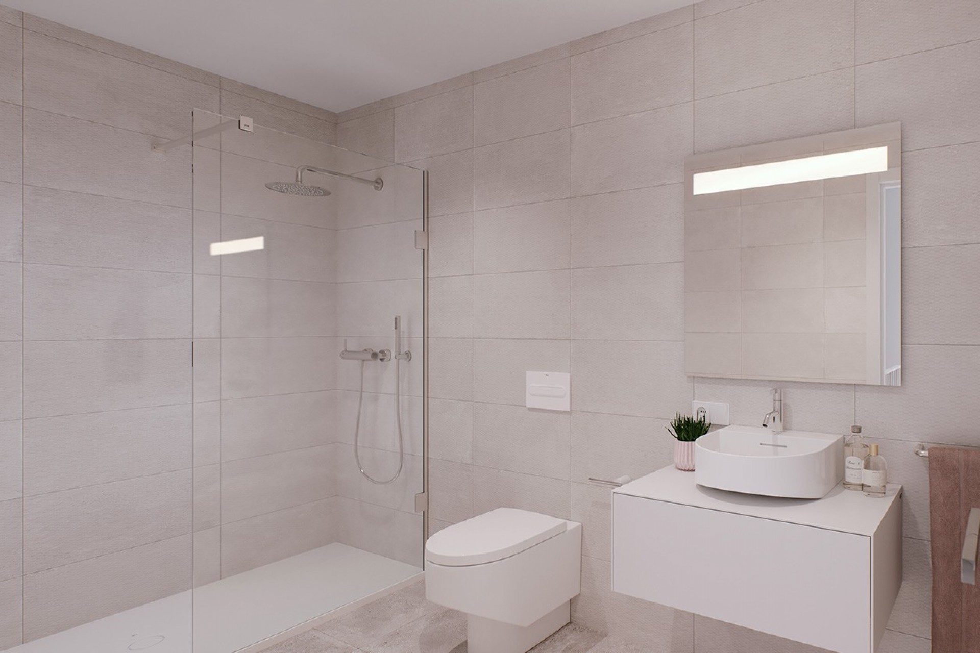 Cimentación y estructura de hormigón armado.Cerramientos con aislamiento térmico y acústico, y tabiquería de yeso laminado con lana de roca.Solado de gres porcelánico de primera calidad y pavimento exterior antideslizante.Carpintería exterior de PVC con rotura de puente térmico y doble acristalamiento.Puerta de entrada acorazada y puertas interiores de DM blanco liso.Cocina equipada con muebles sin tiradores, encimera de cuarzo y electrodomésticos incluidos (vitrocerámica, horno y campana).Preinstalación de aire acondicionado por conductos, aerotermo para ACS y suelo radiante en baños.Iluminación LED empotrada y pintura plástica blanca lavable.