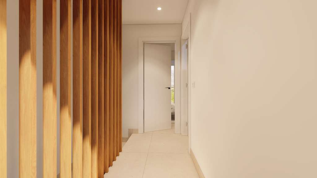 La planta alta alberga los dormitorios y baños, todos con una elegante carpintería interior lacada en blanco, aportando un toque de sofisticación.