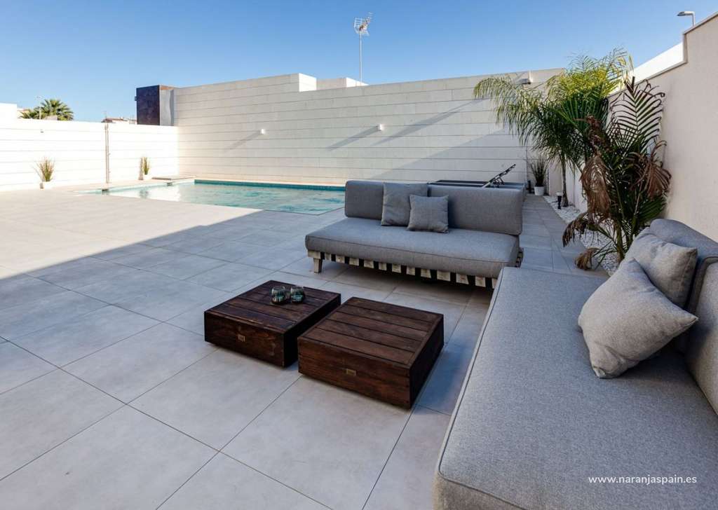 Las villas de nueva construcción de una sola planta tienen 3 dormitorios, 2 baños, cocina abierta con el salón, armarios empotrados, jardín privado con plaza de aparcamiento.