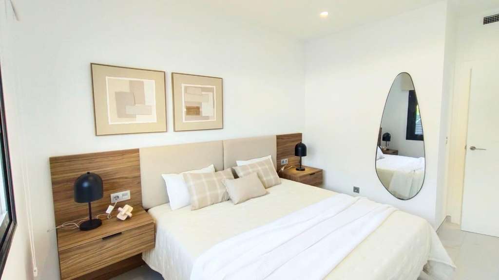 Pequeña promoción de sólo 5 chalets, construidos en una sola planta con una distribución de 3 dormitorios y 2 baños, zona de salón comedor cocina abierta, totalmente equipada, con isla central y vistas a la piscina privada, en parcelas independientes desde