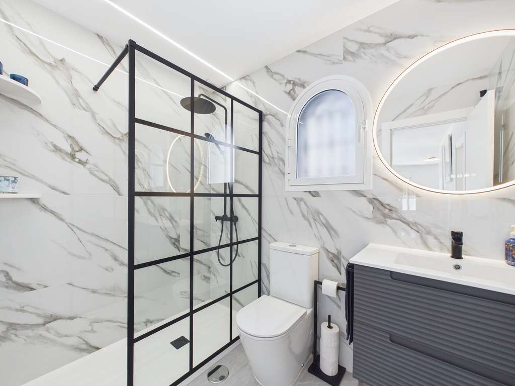 Un pasillo desde la sala de estar conduce a dos dormitorios dobles de tamaño generoso en la planta baja, ambos con armarios empotrados y aire acondicionado frío y caliente recién instalado. Un elegante cuarto de baño con una gran cabina de ducha completa este nivel.