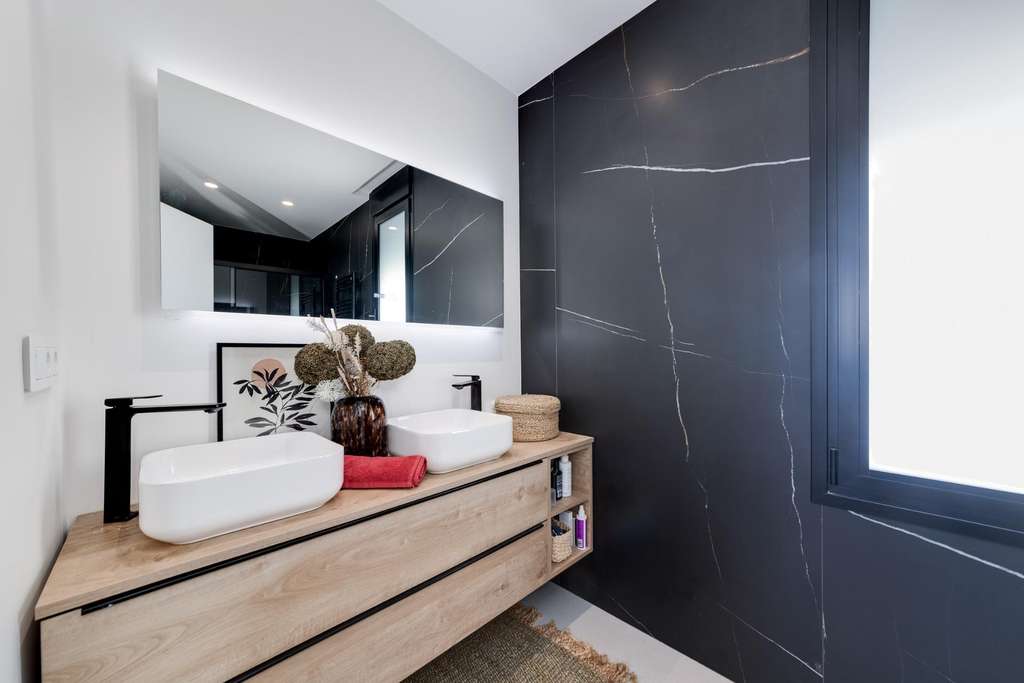 Las villas de obra nueva se distribuyen en 2 plantas, tienen 3 dormitorios, 2 baños, aseo, cocina americana con salón, armarios empotrados, jardín privado con piscina y plaza de aparcamiento.