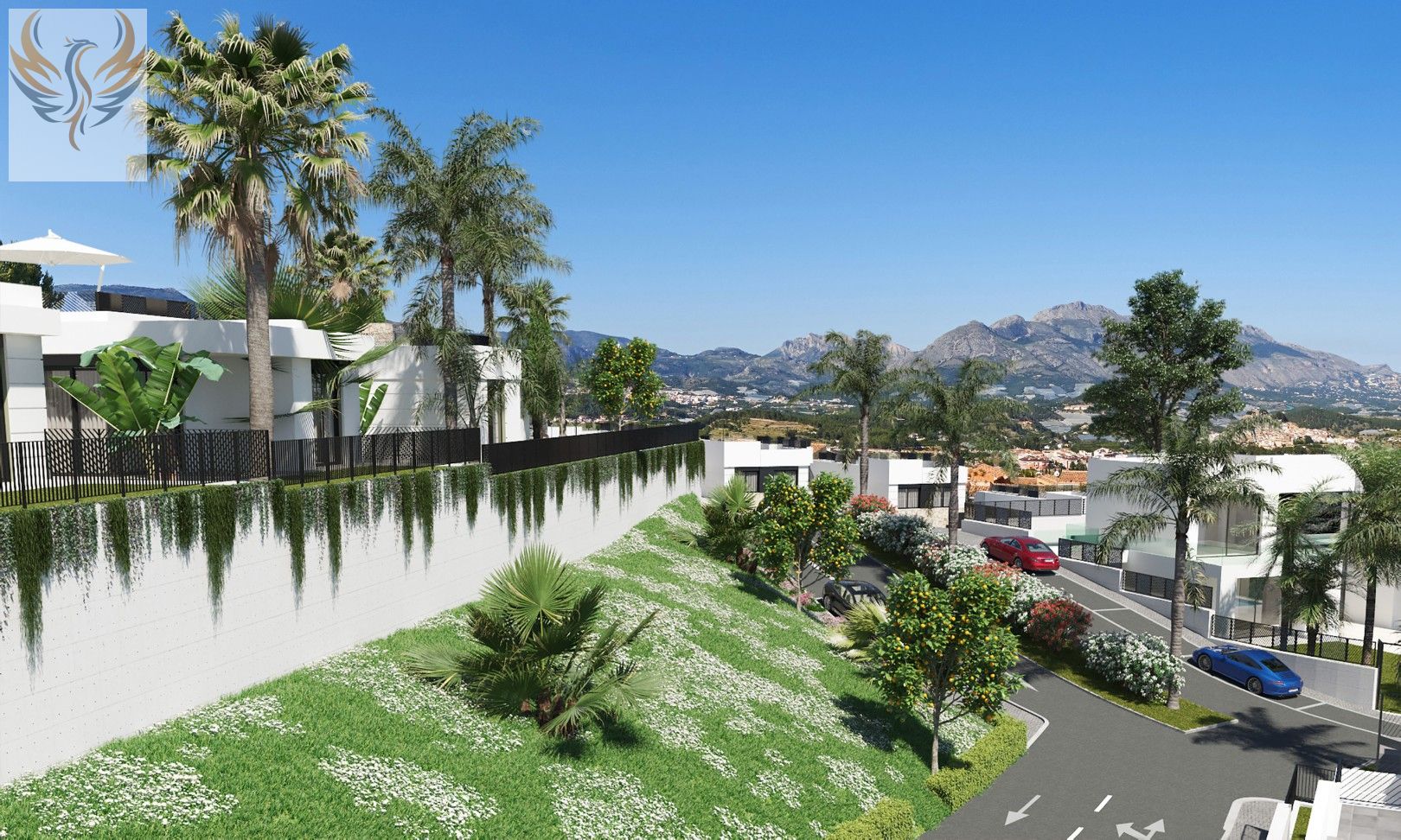 Parcela privativa de cada vivienda. Aparcamiento interno para uno o dos vehículos, según parcela. Terminación de jardín mediante césped artificial y arbolado.