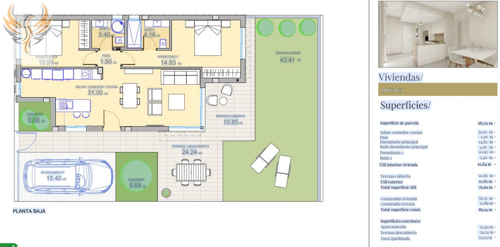 Tipo I15. Con 2 Dormitorios. Superficie Util 76,25 m2. Sup. Construida 89,14 m2. Parcela 185,50 m2. Precio: 295.000 €