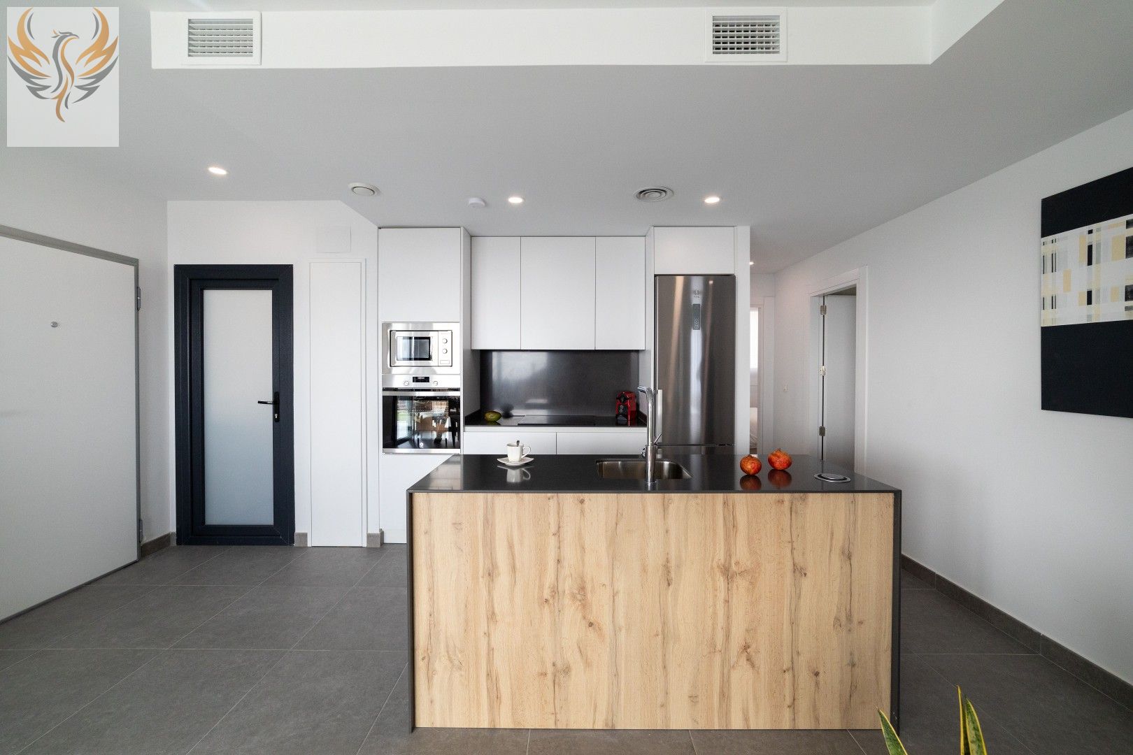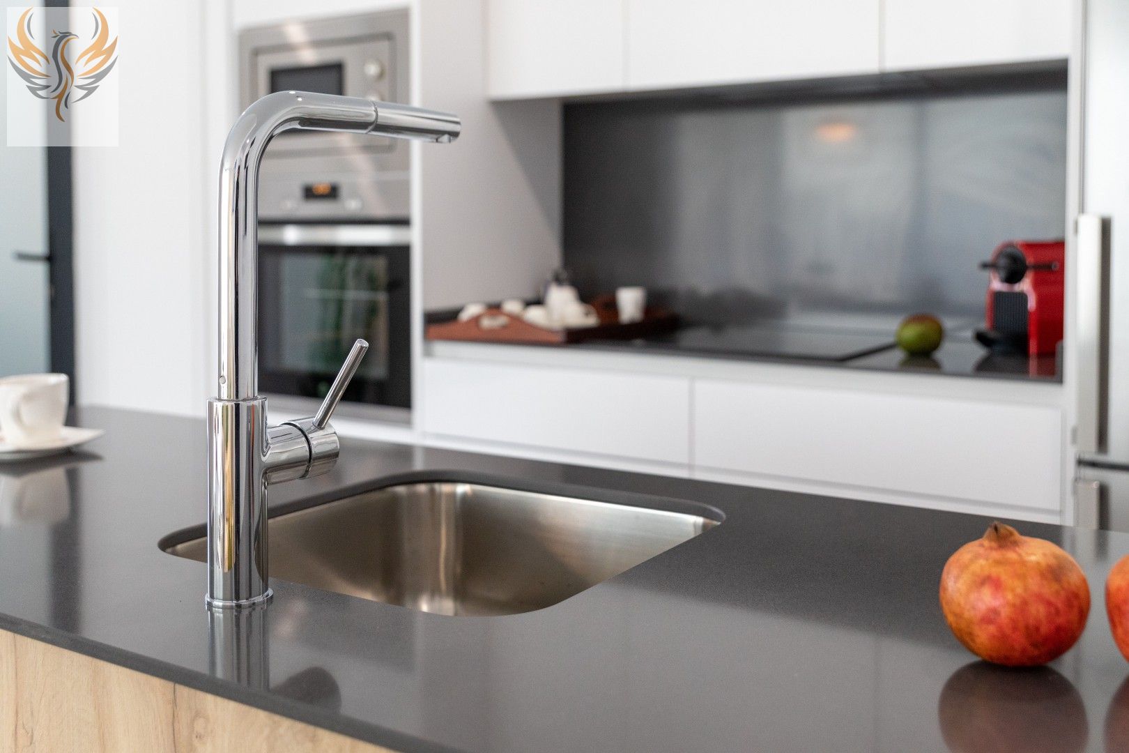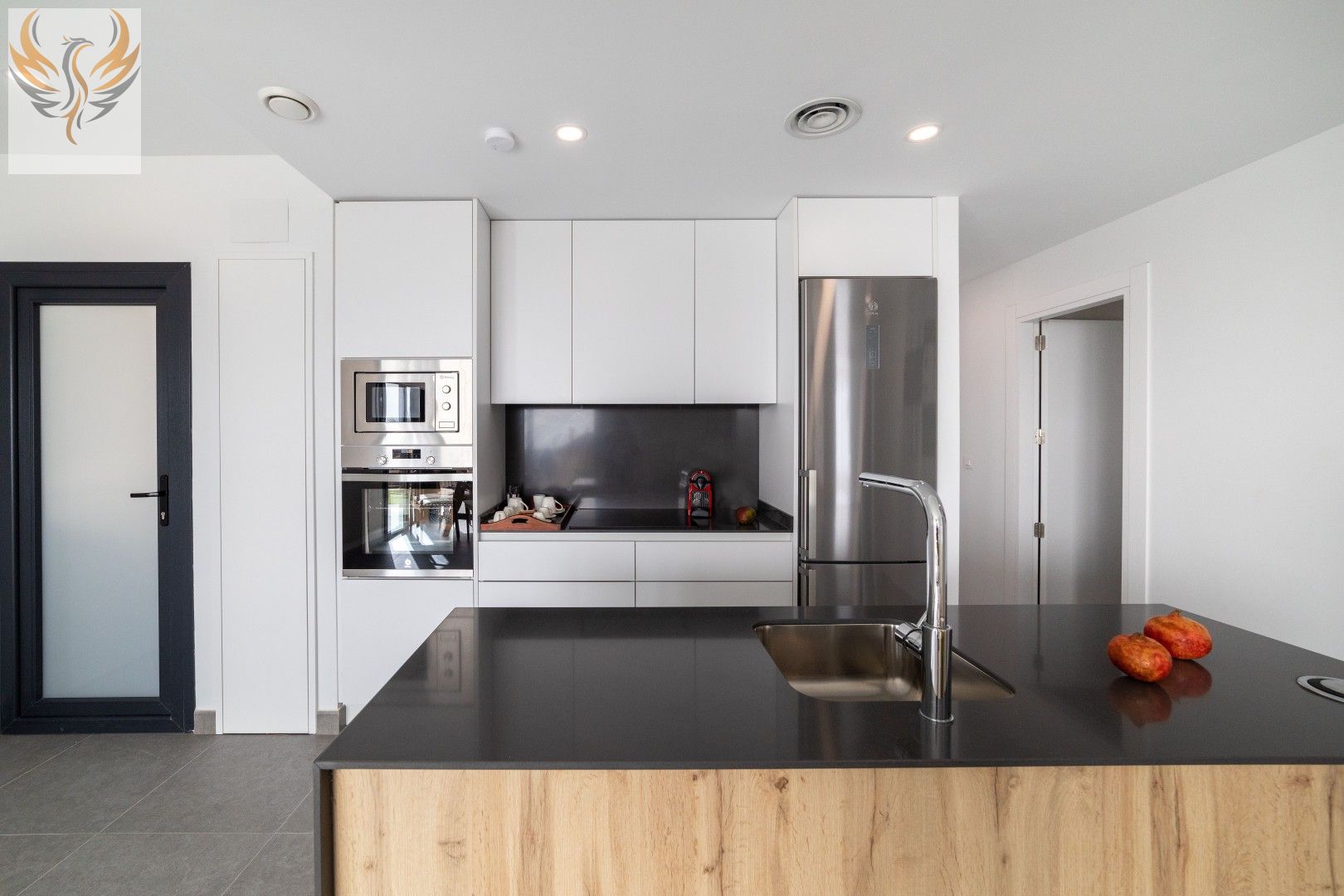 Equipada con muebles altos y bajos. Encimera, frente y costados de muebles bajos de aglomerado de sílice. Dotación de placa de inducción, horno, campana extractora y fregadero de acero inoxidable con grifería monomando cromada orientable.