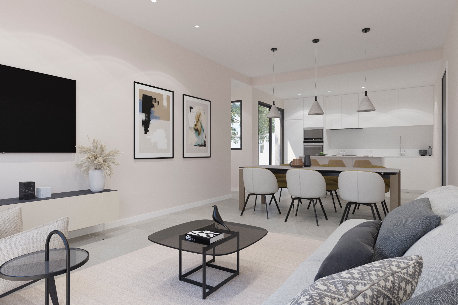 Del interior de las villas queremos destacar la zona del salón comedor con cocina tipo office, consta de 37 m2 aprox. Sabemos las necesidades que tienen nuestros clientes y por eso hemos diseñado una zona funcional, dinámica y elegante. Las villas tienen 3 dormitorios dobles, dos de ellos con armarios de diseño empotrados, la suite tiene un gran vestidor y baño.