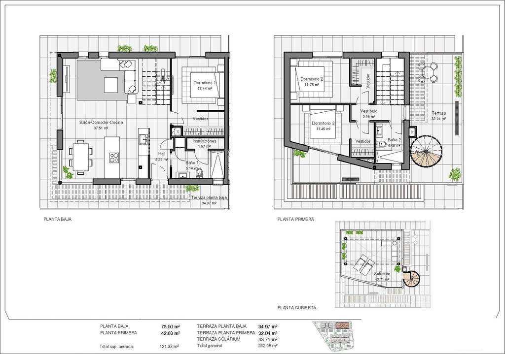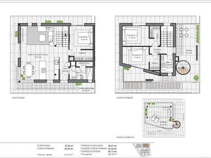 Viviendas modernas con 3 amplios dormitorios con armarios empotrados (el principal en planta baja, con baño y vestidor en suite), 2 amplios baños, gran salón-comedor con cocina abierta, amplias terrazas.