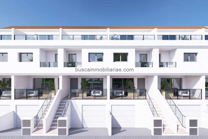 Los exteriores de estas viviendas adosadas en Rafal han sido diseñados para ofrecer un espacio de vida al aire libre que complementa el interior de las casas. Cada propiedad cuenta con una terraza privada, ideal para disfrutar de momentos de relax o para organizar reuniones familiares al aire libre. Además, las viviendas disponen de un garaje, proporcionando comodidad y seguridad para el estacionamiento de vehículos. El diseño exterior se integra armoniosamente con el entorno, ofreciendo un espacio atractivo y funcional que invita a disfrutar del clima mediterráneo durante todo el año. Las áreas ajardinadas comunitarias añaden un toque de verdor y frescura al conjunto, creando un ambiente sereno y agradable para todos los residentes.