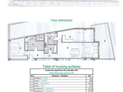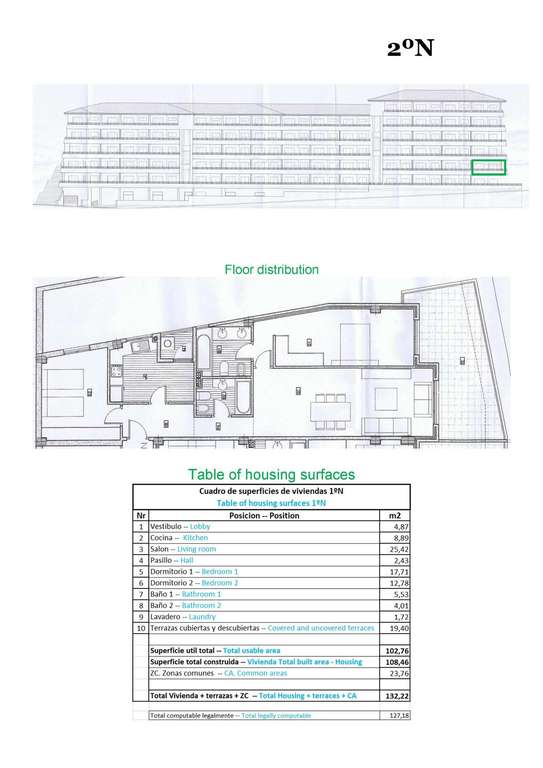 El edificio tiene 7 plantas con 2 escaleras y sus 2 ascensores. En el sótano hay 69 plazas de aparcamiento y 42 trasteros. En la planta baja está la piscina cubierta climatizada, una gran sala para uso de todos los propietarios y dos locales comerciales, en la azotea está la piscina exterior con sus terrazas.