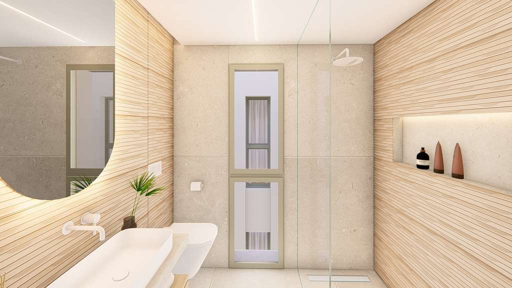 Los acabados de la casa son de alto nivel, incluyendo suelos y revestimientos porcelánicos de gran formato y las viviendas estarán equipadas con persianas motorizadas y se instalará aire acondicionado por conductos , incluido el electrodoméstico.