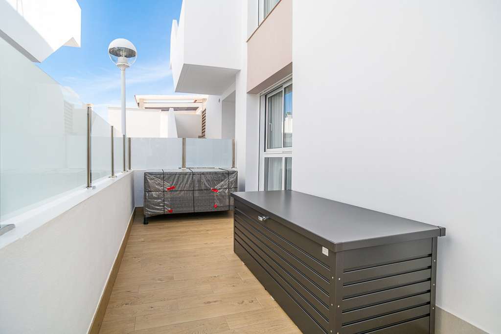 En el interior, encontrará dos amplios dormitorios con armarios empotrados y dos modernos baños. El luminoso y abierto salón se integra a la perfección con la cocina totalmente equipada. Desde el salón, podrá acceder directamente a la amplia terraza privada, perfecta para tomar un café al sol de la mañana, disfrutar de una acogedora barbacoa o simplemente del aire libre. En la parte trasera, hay una terraza adicional donde podrá disfrutar del sol de la mañana con total privacidad.