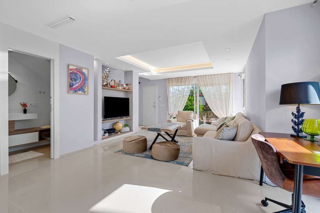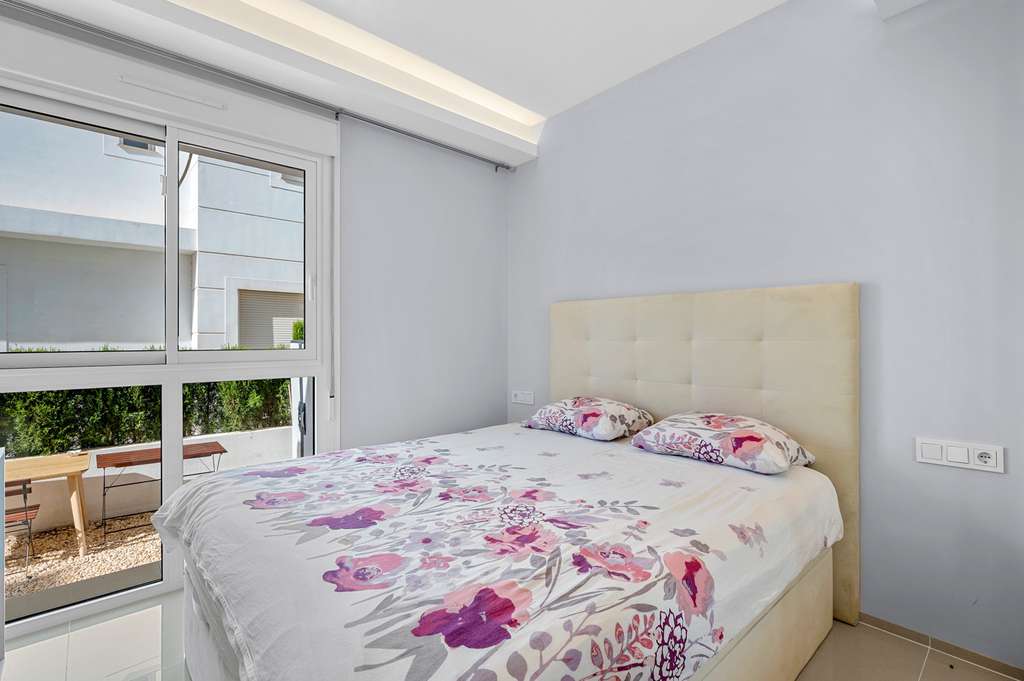 En la planta baja se encuentra un amplio y luminoso salón con cocina abierta, un dormitorio, un cuarto de servicio y salida directa a la terraza y al jardín privado — el lugar perfecto para disfrutar del desayuno o de una cena al aire libre rodeado de vegetación. En la planta superior hay dos cómodos dormitorios, cada uno con su propio baño en suite y balcón. En la azotea, un amplio solárium ofrece una zona privada ideal para relajarse y tomar el sol durante todo el año.
